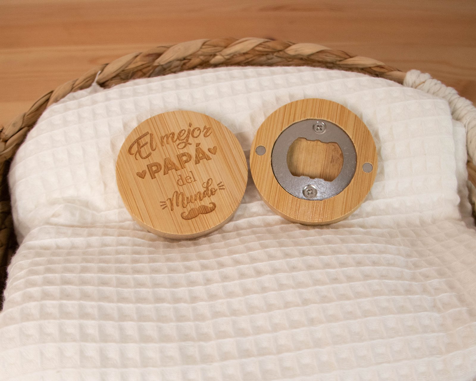 Abridor de botellas de bambú con imán para papá. Diseño elegante, grabado especial y funcionalidad práctica.