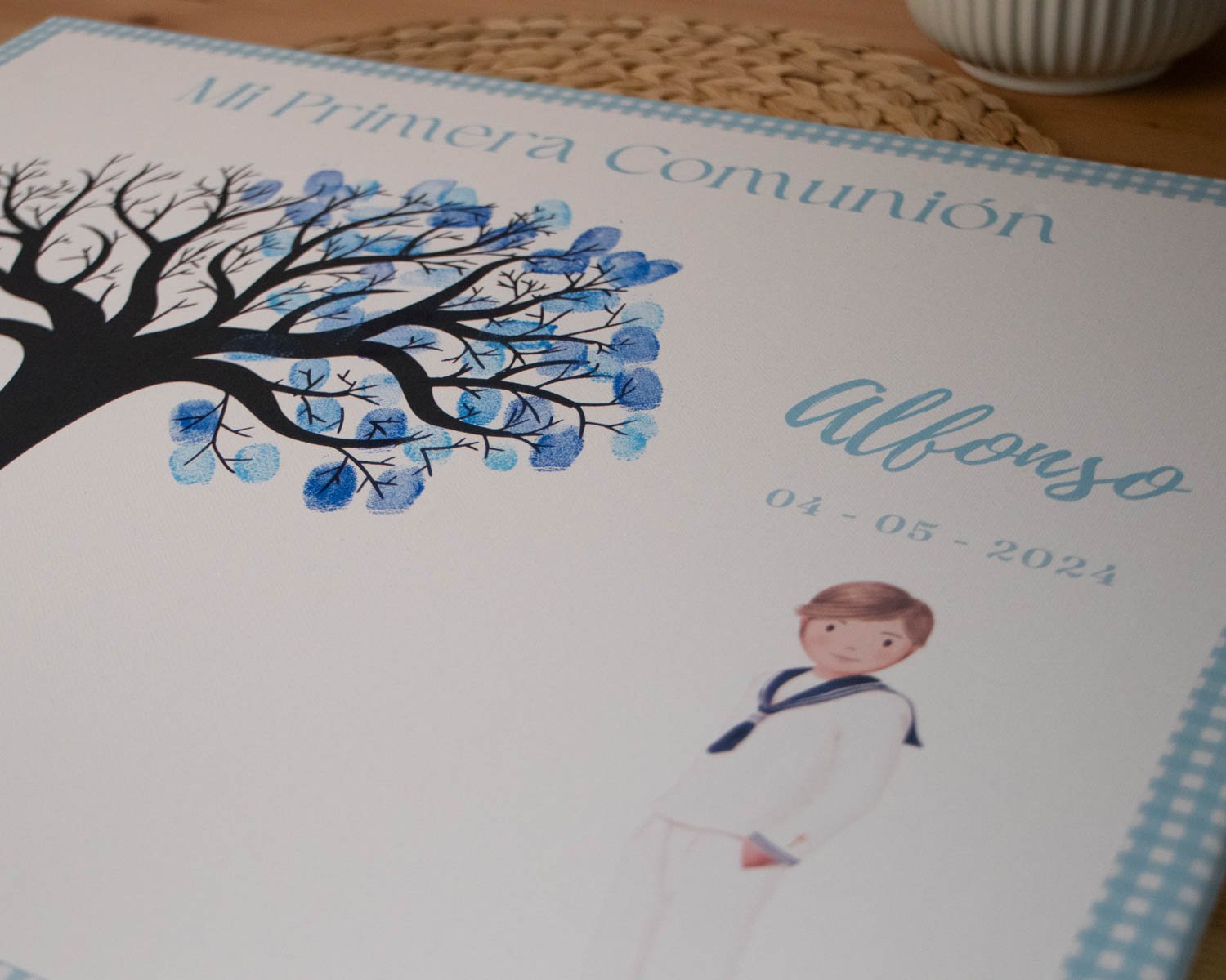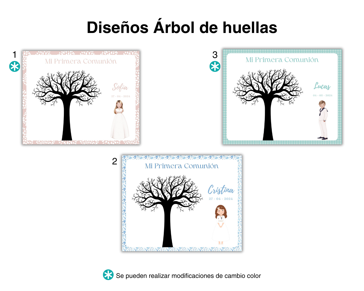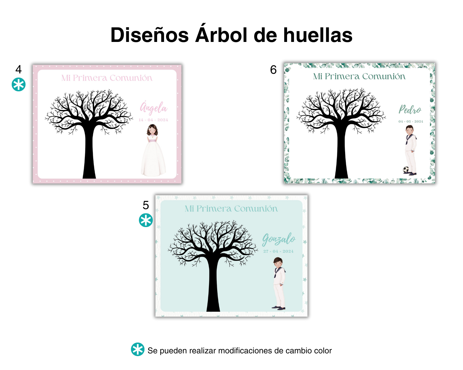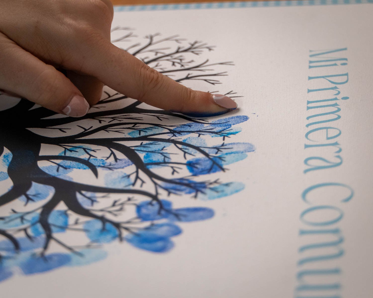 El árbol de huellas, una manera mágica y única de crear un recuerdo precioso del Día de la Primera Comunión de tu peque. Los invitados que comparten ese día tan especial dejarán su huella creando las hojas del árbol, creando un resultado precioso. El árbol de huellas es una alternativa o complemento del típico libro de firmas. Se trata de una ilustración de un árbol sin hojas, los invitados con pintura pondrán dejarán sus huellas, creando así las hojas del árbol. Podéis dejar el árbol solo con las huellas o incluso se puede poner el nombre en cada huella para tener más presentes a todas las personas que compartieron con vosotros ese día tan especial. Luego, se puede colgar en la habitación del peque y tener para siempre un recuerdo de aquel día tan bonito. Puesto que se presenta con un bastidor de madera. Puedes querer poner una foto del niño/a, en vez del dibujo de comunión. Hay 12 diseños diferentes, estos tienen posibles variaciones, como cambiar el color del fondo. Los diseños que tienen posibilidad de realizar variaciones están señaladas con asteriscos. Por lo que, si seleccionas una de estos diseños debes escribir en la casilla de CARACTERISTICAS, aquellos cambios que deseas realizar. Además, debes poner las características del niño o niña de comunión, para que el dibujo se asemeje lo máximo posible. Sólo cambian características del pelo y de la ropa. Por ejemplo, quiero el Modelo 1, pero quiero cambiarle cosas. En la casilla de características, escribo: Modelo 1, fondo verde agua, niño de comunión rubio con traje tipo marinero. Sorprende con nuestro Árbol de huellas para Primera Comunión.
