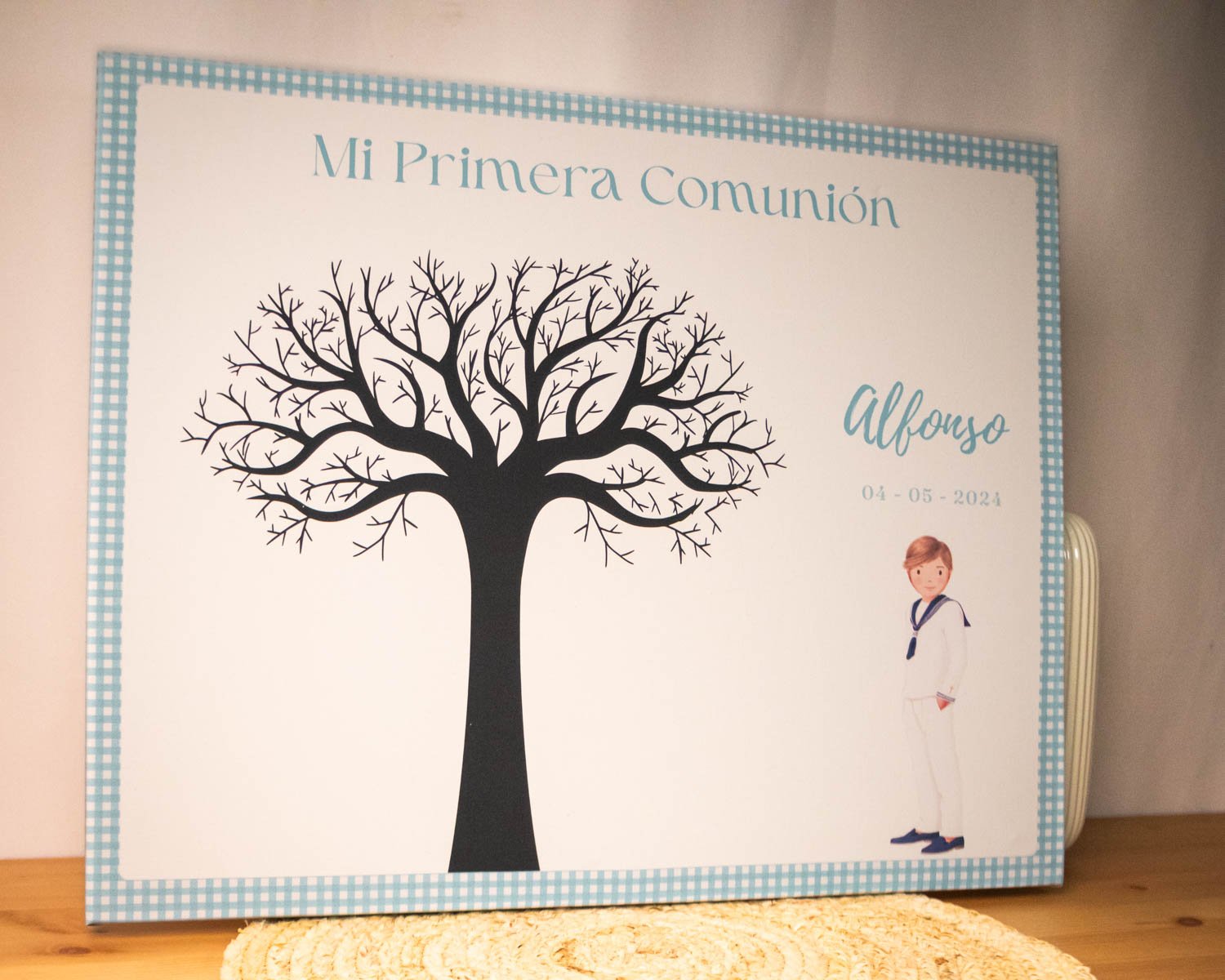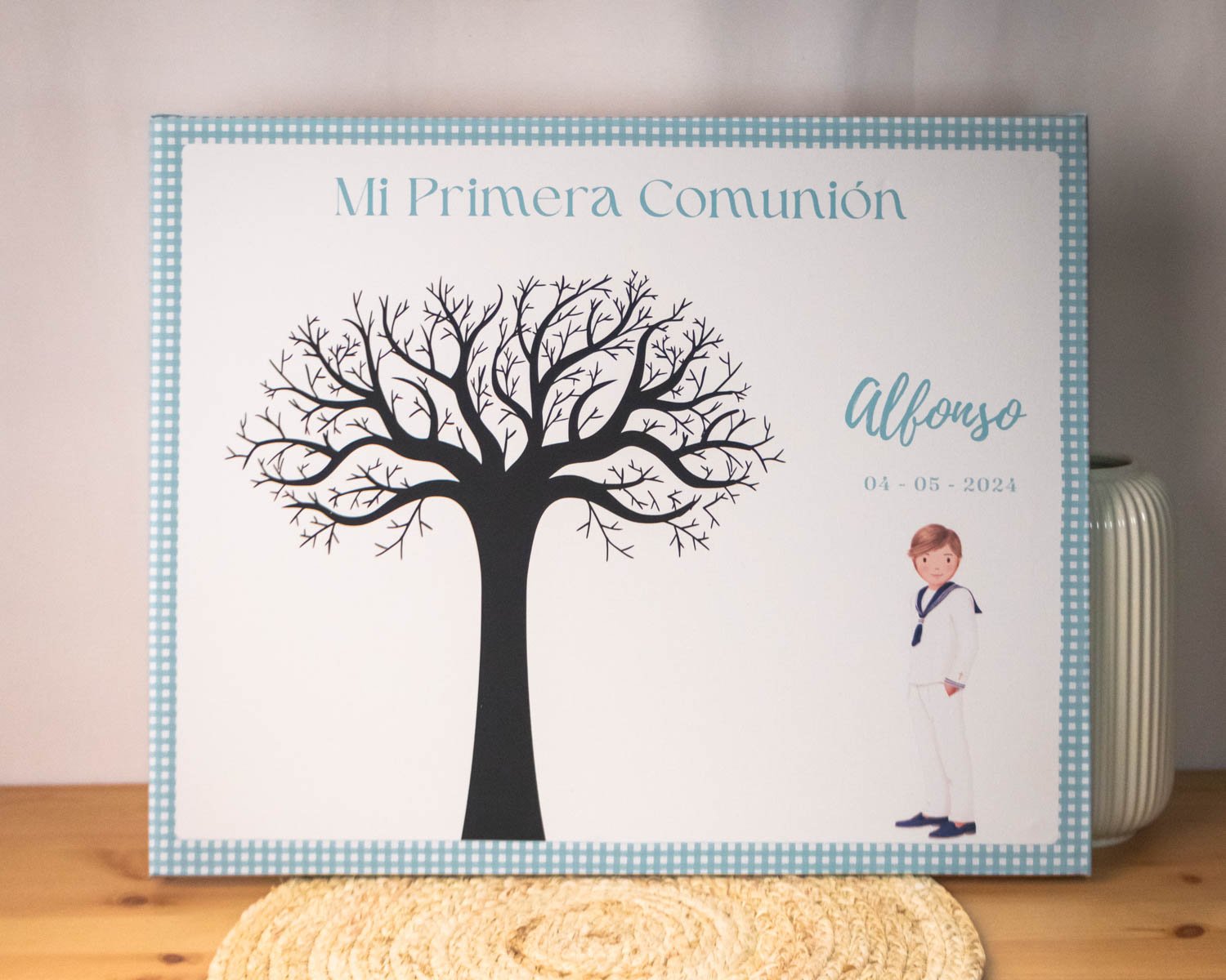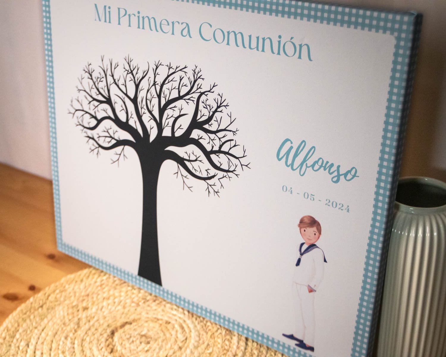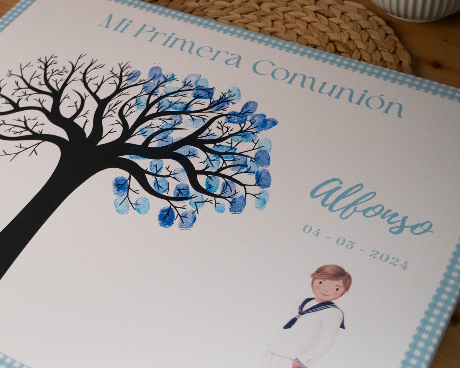 El árbol de huellas, una manera mágica y única de crear un recuerdo precioso del Día de la Primera Comunión de tu peque. Los invitados que comparten ese día tan especial dejarán su huella creando las hojas del árbol, creando un resultado precioso. El árbol de huellas es una alternativa o complemento del típico libro de firmas. Se trata de una ilustración de un árbol sin hojas, los invitados con pintura pondrán dejarán sus huellas, creando así las hojas del árbol. Podéis dejar el árbol solo con las huellas o incluso se puede poner el nombre en cada huella para tener más presentes a todas las personas que compartieron con vosotros ese día tan especial. Luego, se puede colgar en la habitación del peque y tener para siempre un recuerdo de aquel día tan bonito. Puesto que se presenta con un bastidor de madera. Puedes querer poner una foto del niño/a, en vez del dibujo de comunión. Hay 12 diseños diferentes, estos tienen posibles variaciones, como cambiar el color del fondo. Los diseños que tienen posibilidad de realizar variaciones están señaladas con asteriscos. Por lo que, si seleccionas una de estos diseños debes escribir en la casilla de CARACTERISTICAS, aquellos cambios que deseas realizar. Además, debes poner las características del niño o niña de comunión, para que el dibujo se asemeje lo máximo posible. Sólo cambian características del pelo y de la ropa. Por ejemplo, quiero el Modelo 1, pero quiero cambiarle cosas. En la casilla de características, escribo: Modelo 1, fondo verde agua, niño de comunión rubio con traje tipo marinero. Sorprende con nuestro Árbol de huellas para Primera Comunión.