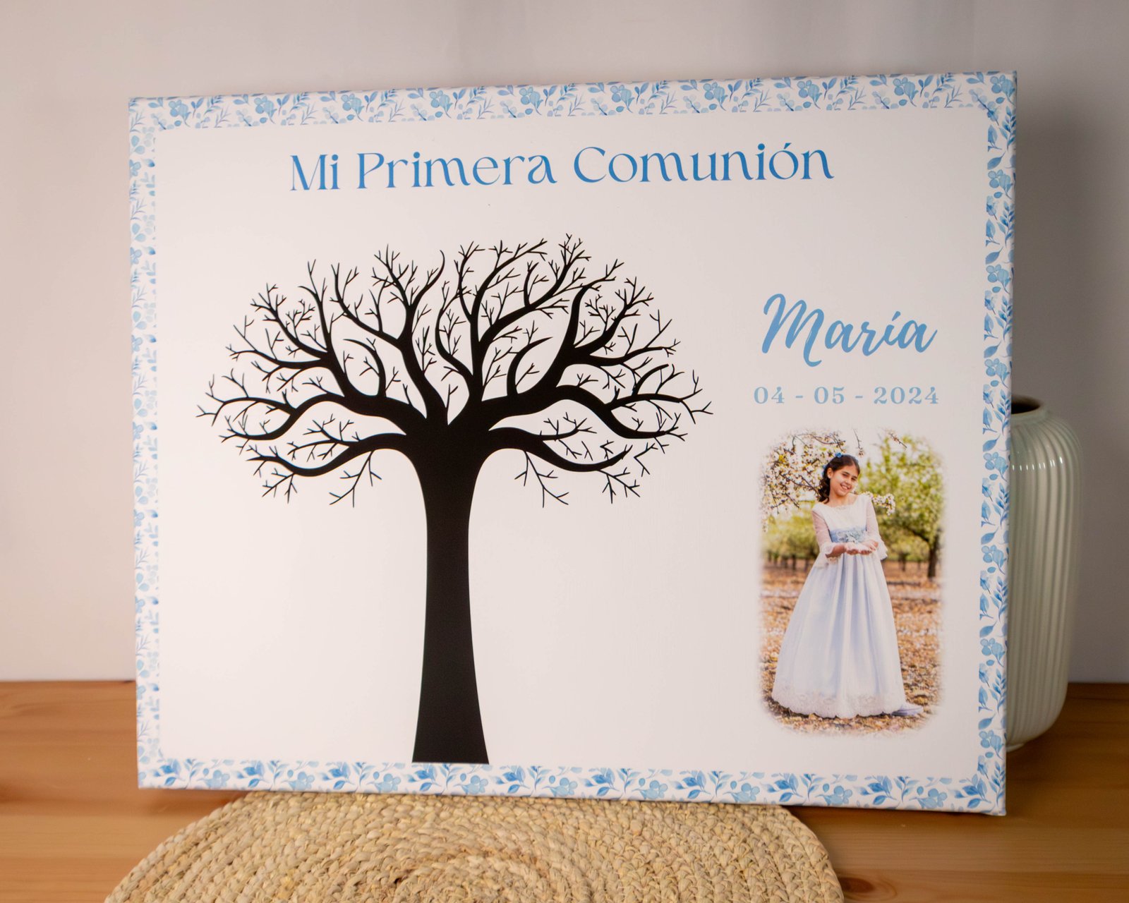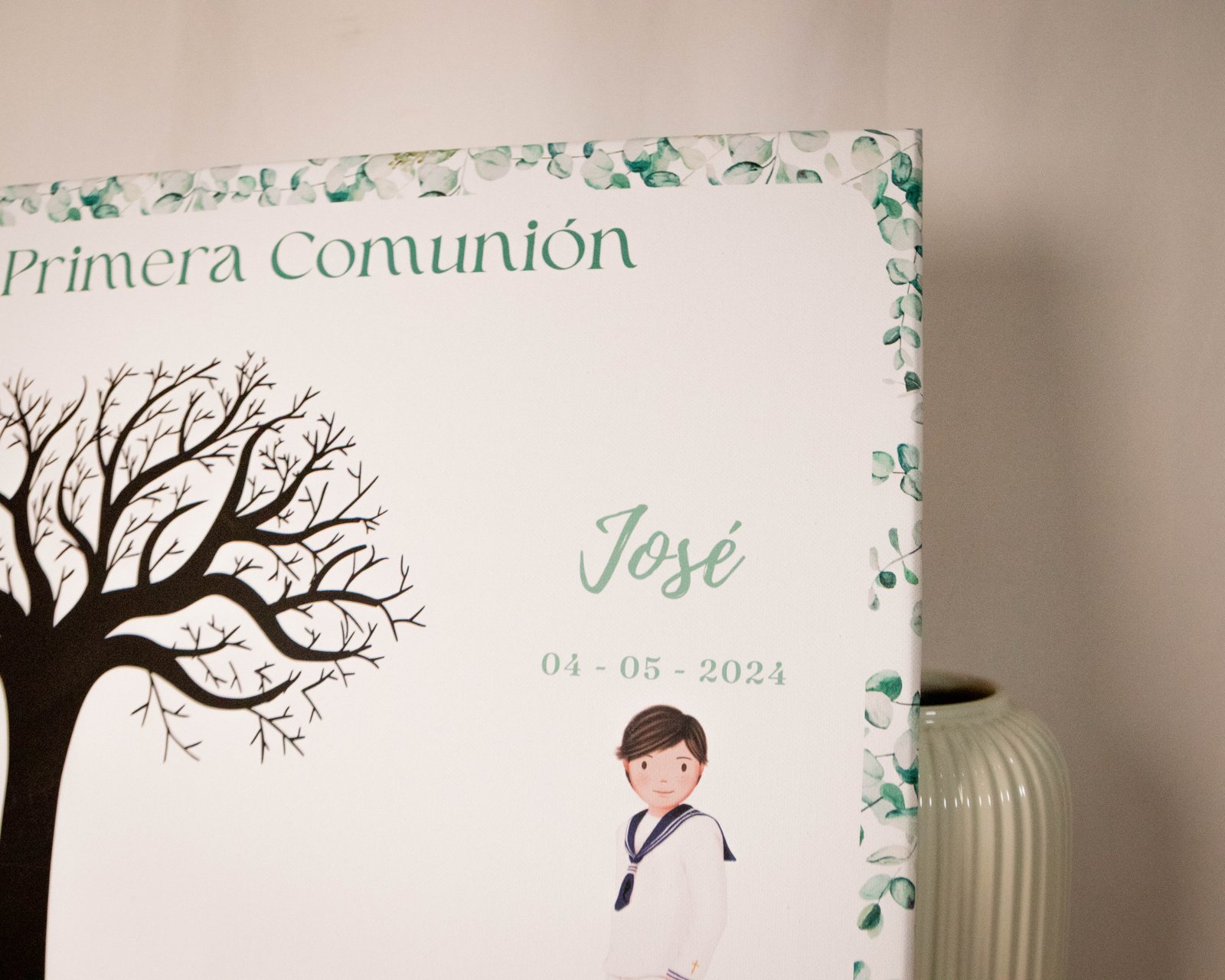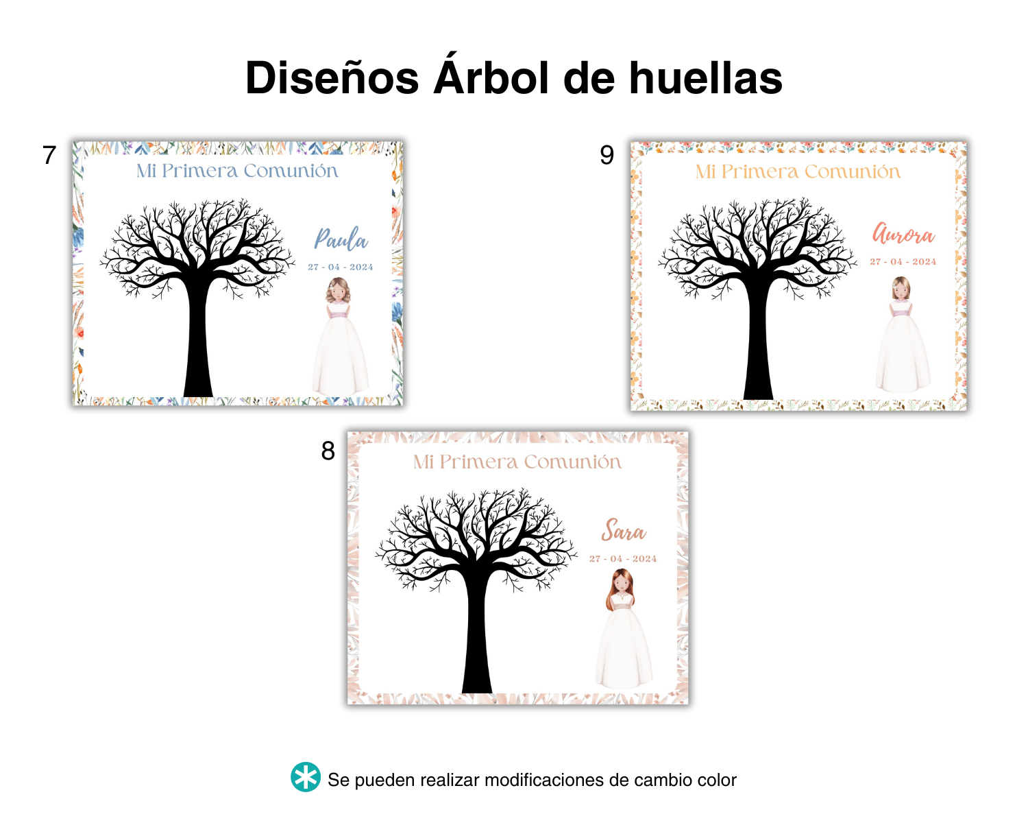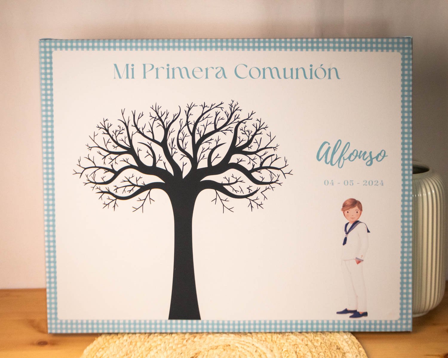 El árbol de huellas, una manera mágica y única de crear un recuerdo precioso del Día de la Primera Comunión de tu peque. Los invitados que comparten ese día tan especial dejarán su huella creando las hojas del árbol, creando un resultado precioso. El árbol de huellas es una alternativa o complemento del típico libro de firmas. Se trata de una ilustración de un árbol sin hojas, los invitados con pintura pondrán dejarán sus huellas, creando así las hojas del árbol. Podéis dejar el árbol solo con las huellas o incluso se puede poner el nombre en cada huella para tener más presentes a todas las personas que compartieron con vosotros ese día tan especial. Luego, se puede colgar en la habitación del peque y tener para siempre un recuerdo de aquel día tan bonito. Puesto que se presenta con un bastidor de madera. Puedes querer poner una foto del niño/a, en vez del dibujo de comunión. Hay 12 diseños diferentes, estos tienen posibles variaciones, como cambiar el color del fondo. Los diseños que tienen posibilidad de realizar variaciones están señaladas con asteriscos. Por lo que, si seleccionas una de estos diseños debes escribir en la casilla de CARACTERISTICAS, aquellos cambios que deseas realizar. Además, debes poner las características del niño o niña de comunión, para que el dibujo se asemeje lo máximo posible. Sólo cambian características del pelo y de la ropa. Por ejemplo, quiero el Modelo 1, pero quiero cambiarle cosas. En la casilla de características, escribo: Modelo 1, fondo verde agua, niño de comunión rubio con traje tipo marinero. Sorprende con nuestro Árbol de huellas para Primera Comunión.