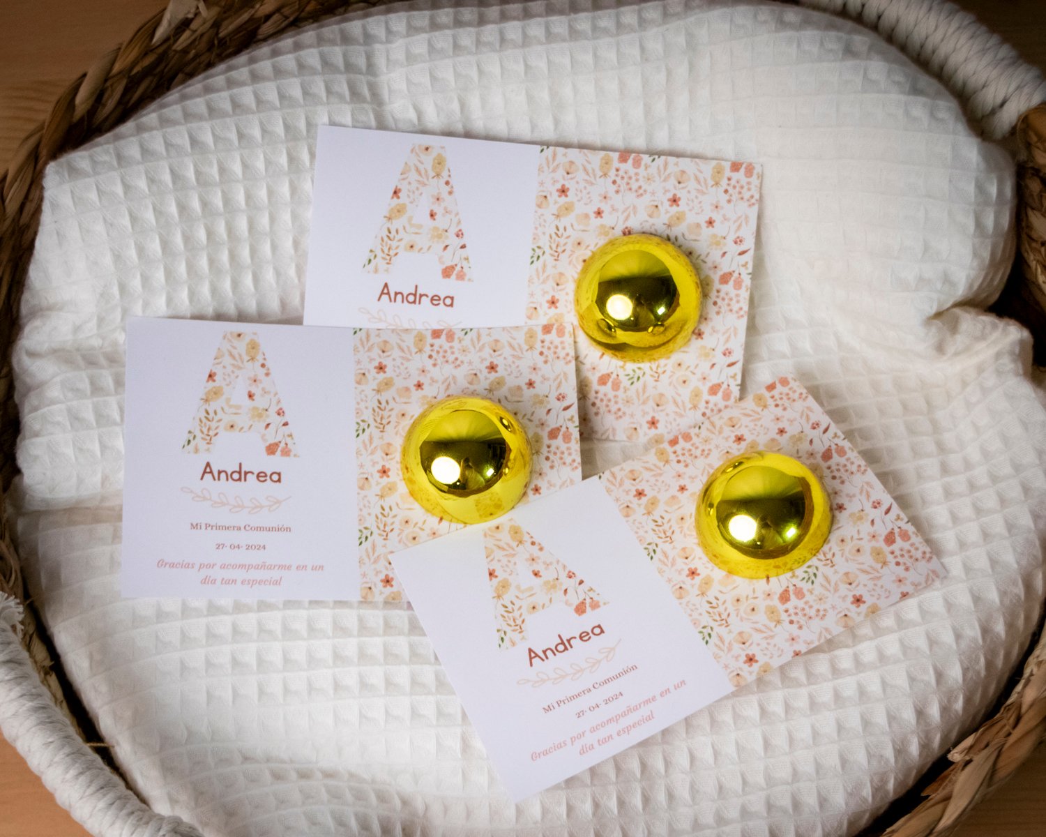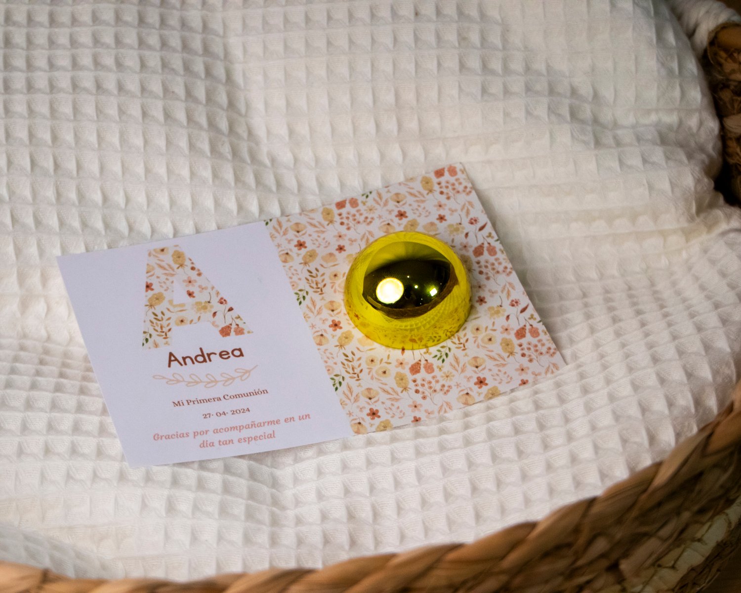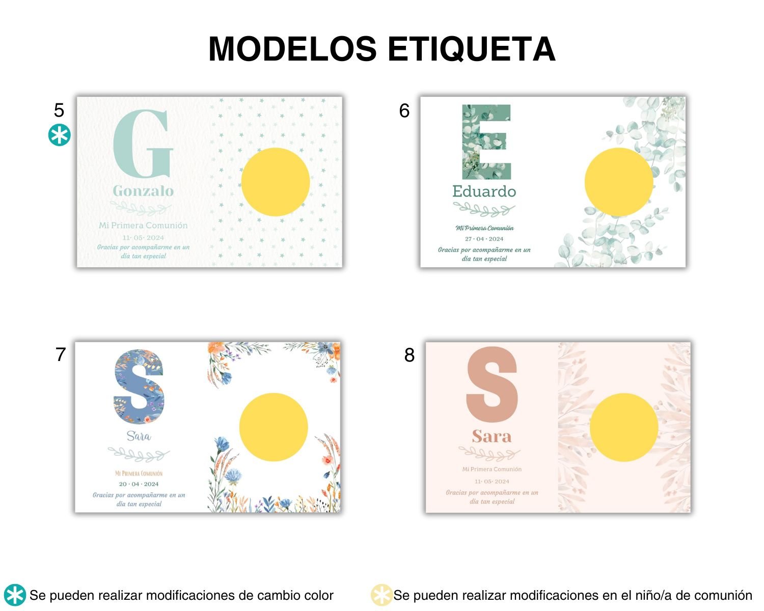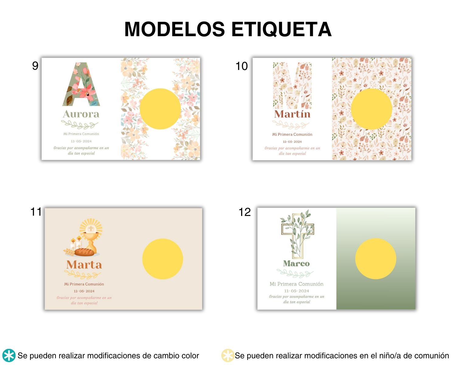Las etiquetas son totalmente personalizadas con los datos de la comunión. Puedes elegir el modelo que más te guste o una foto y añadir el nombre, la fecha, una frase de la celebración…