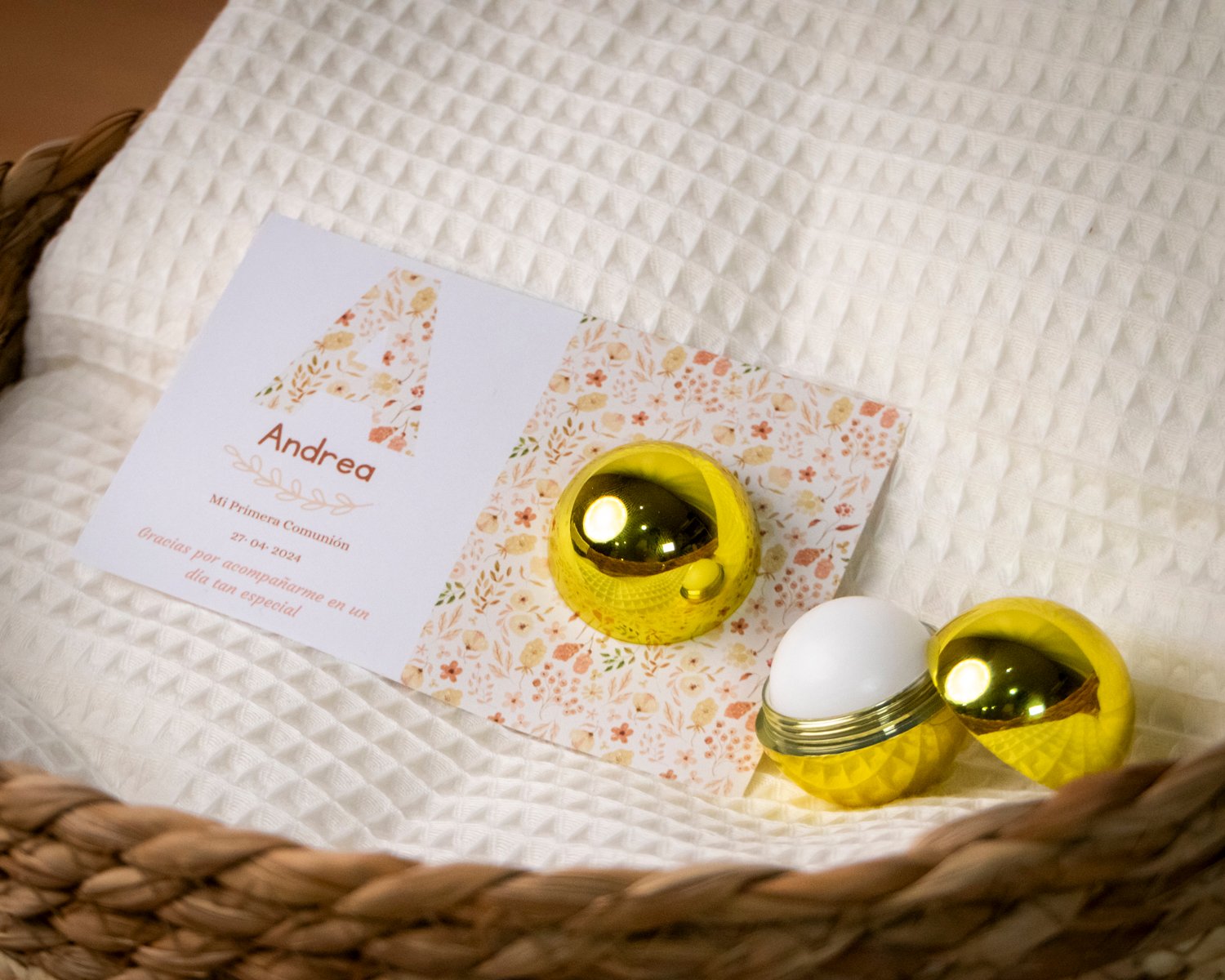 Sorprende a tus invitados con este detalle único como recuerdo de la Primera Comunión de tu peque, un bálsamo labial. Podrás elegir entre distintos diseños de etiquetas con todos los datos del día del evento.