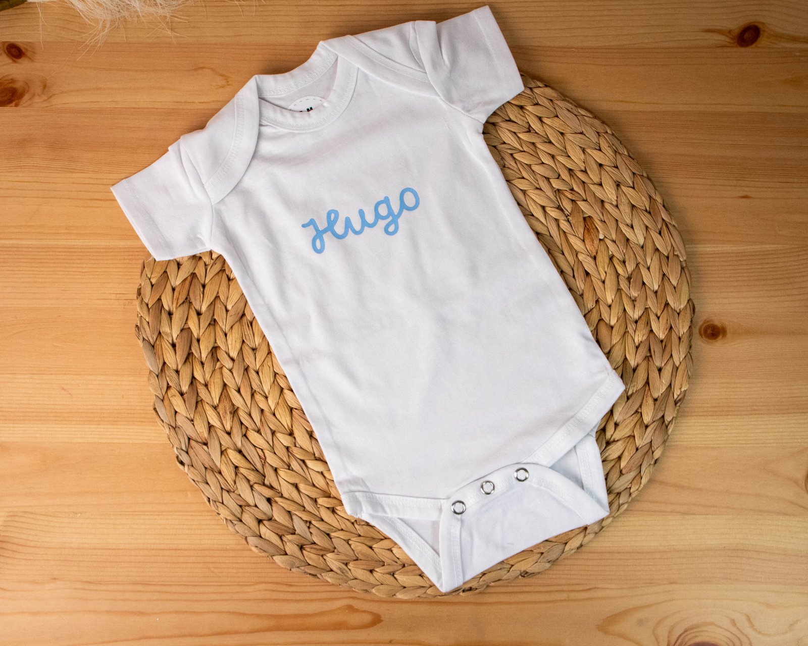 Lo más especial de este body es la personalización: el nombre del niño se imprime en una divertida y clara tipografía escolar, dándole un toque único y personalizado, hace de este body un regalo ideal para nacimientos, bautizos o cualquier ocasión especial. Además, es una excelente forma de hacer que la ropa de tu bebé sea única y un recuerdo inolvidable, convirtiéndolo en una prenda totalmente exclusiva.
