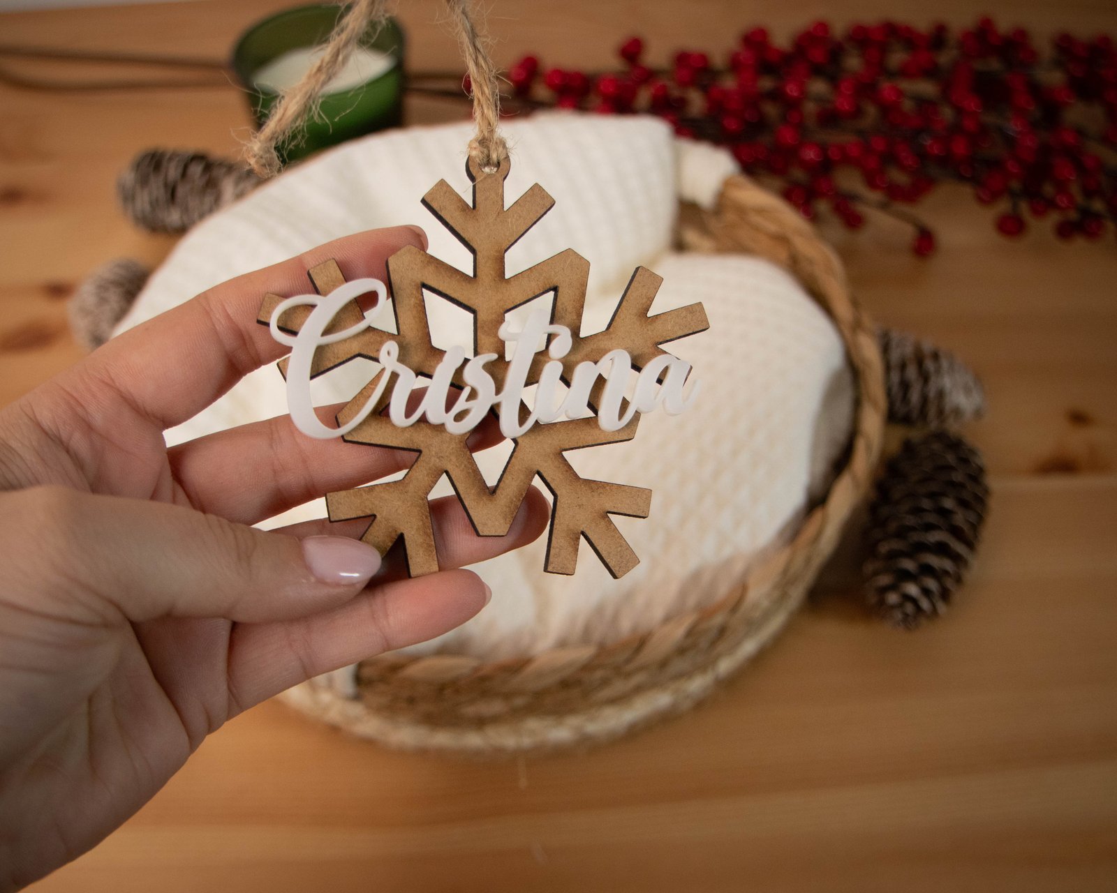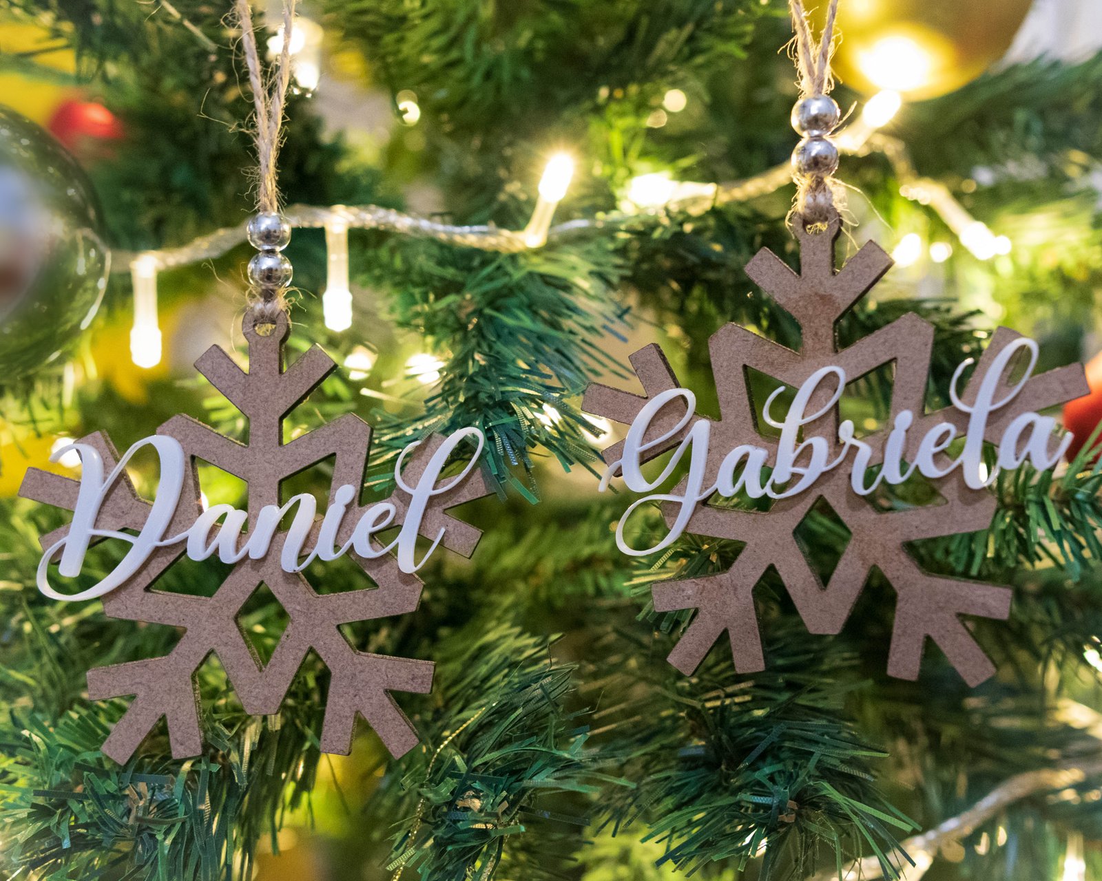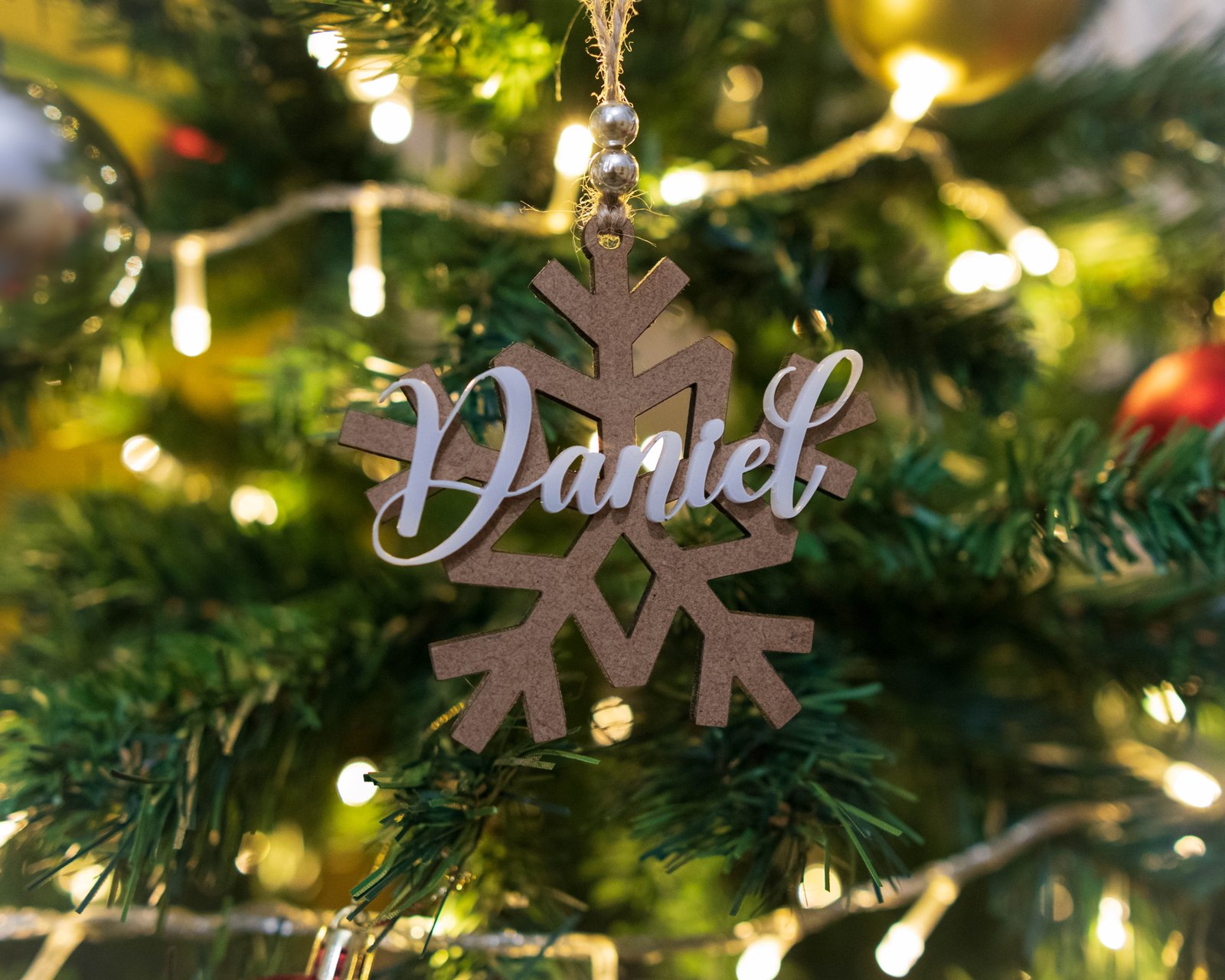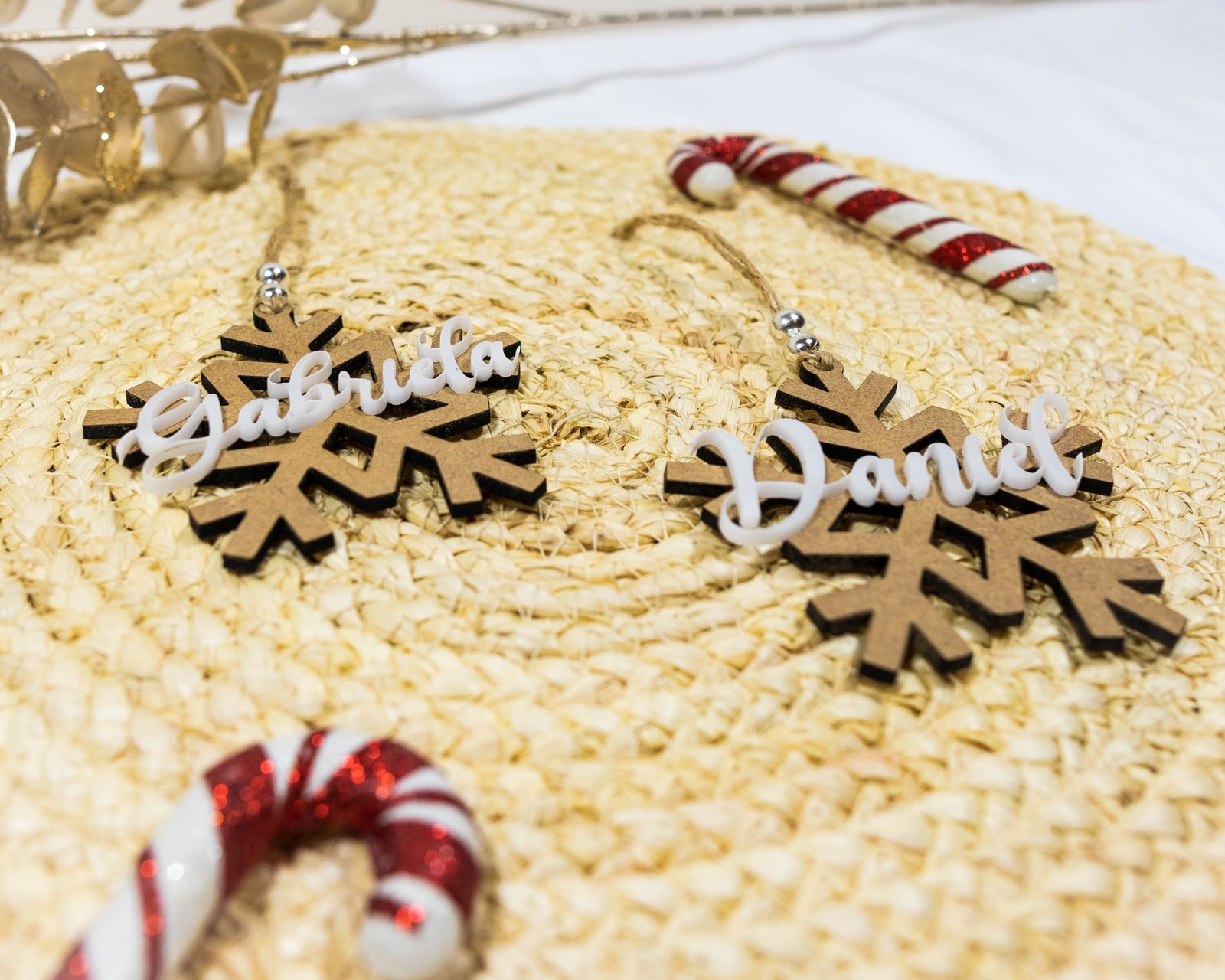 Ilumina tu árbol de Navidad con nuestro elegante adorno modelo Copo de Nieve. Personalizado con el nombre y dale magia a tu decoración navideña.