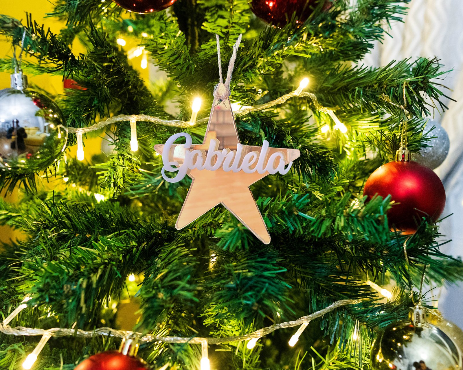 Este elegante adorno en forma de estrella, con un acabado dorado y el nombre de tu elección, es perfecto para añadir un toque de distinción y personalización a tu decoración navideña.