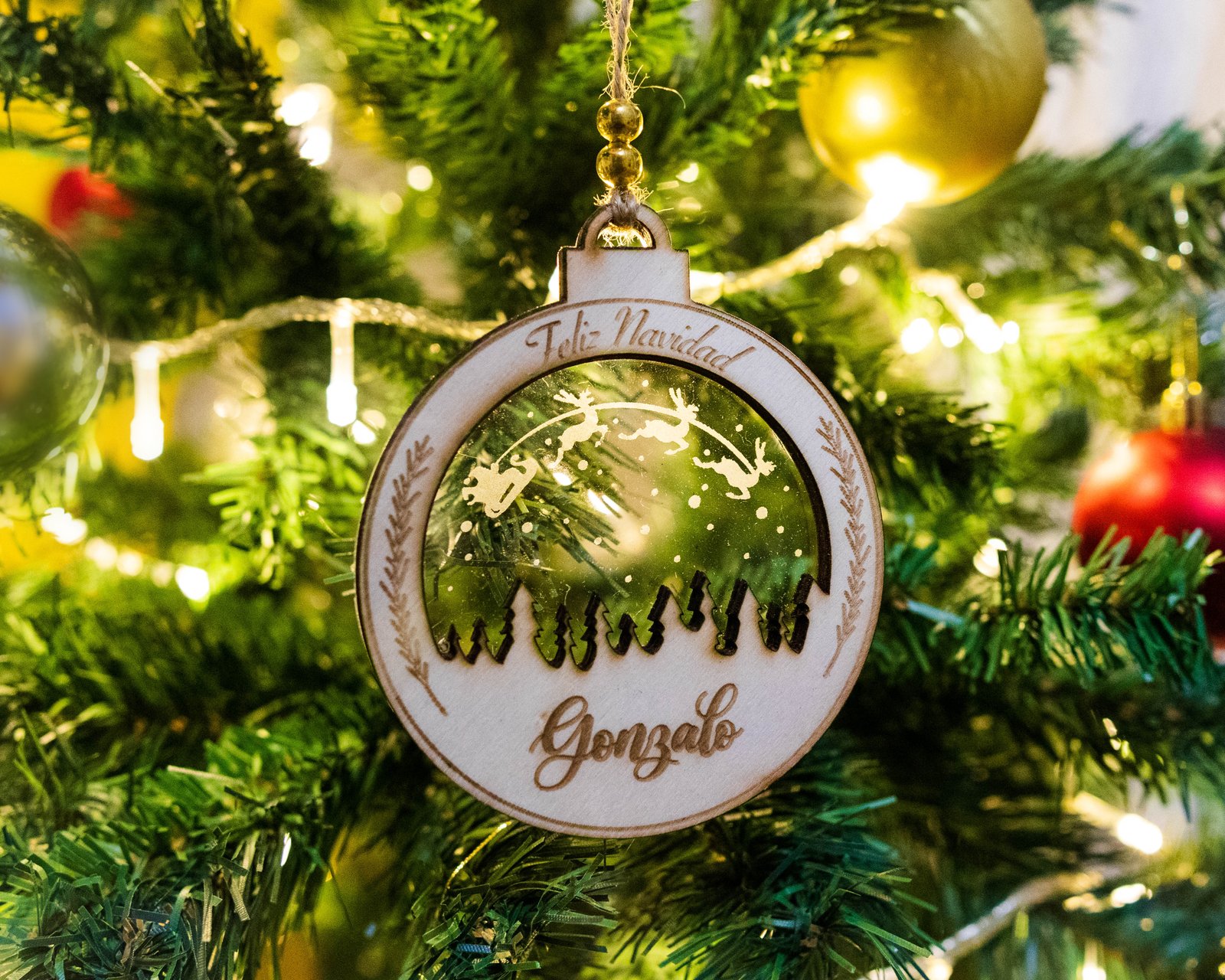 El diseño incluye detalles grabados que aportan profundidad y realismo, mientras que la personalización con el nombre de tu elección lo convierte en un adorno único y especial.