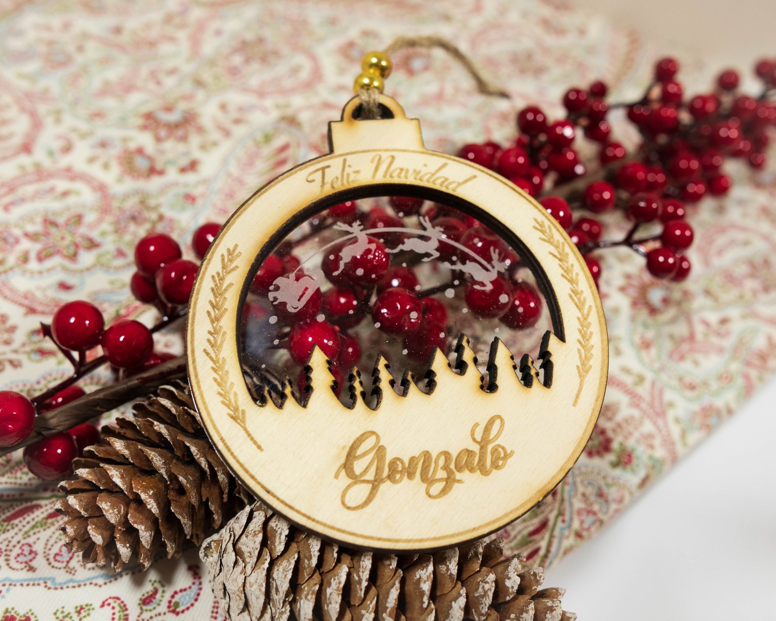 Haz que tu árbol de Navidad sea aún más especial este año con nuestra bola de Navidad modelo Papá Noel, personalizada en madera y metacrilato. Un adorno navideño elegante y único, ideal para tu árbol o para regalar.