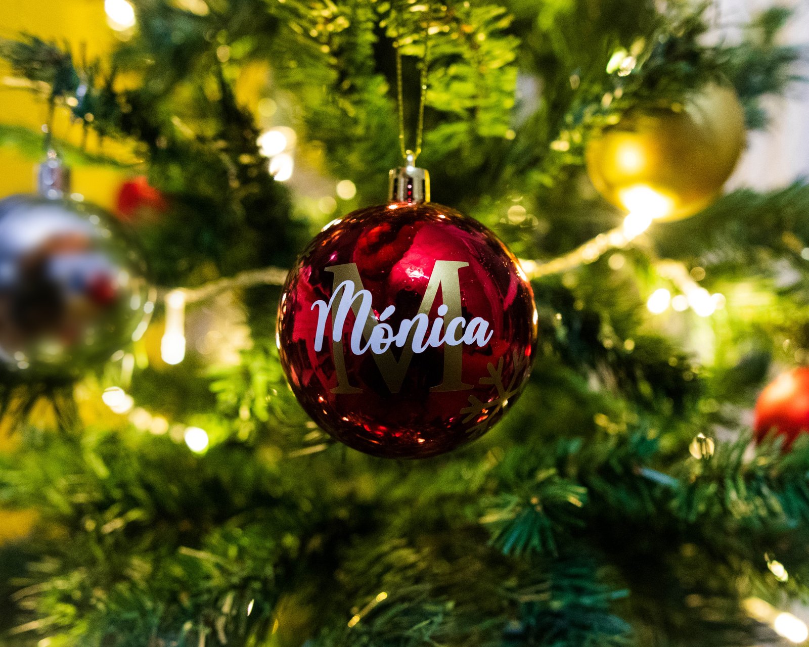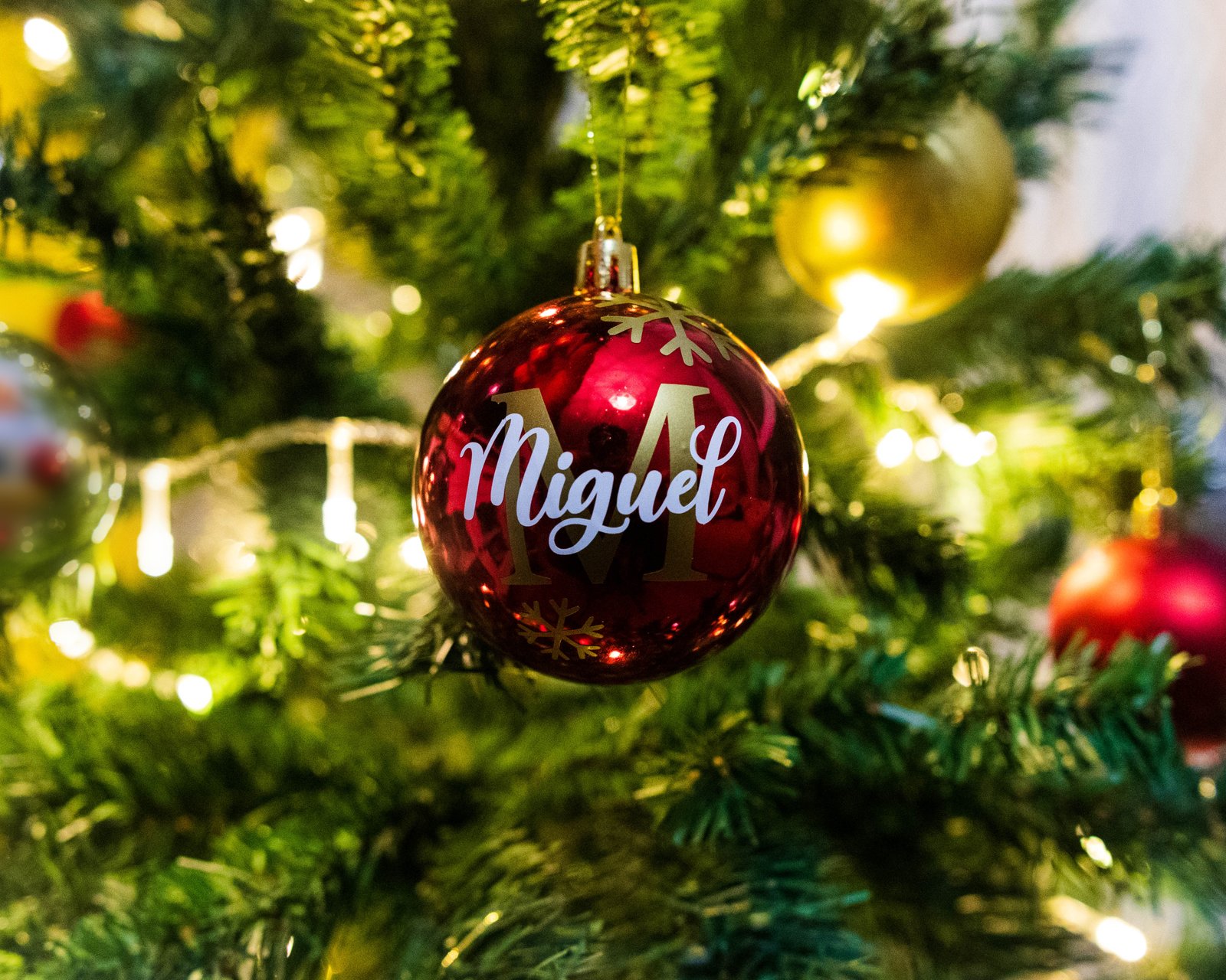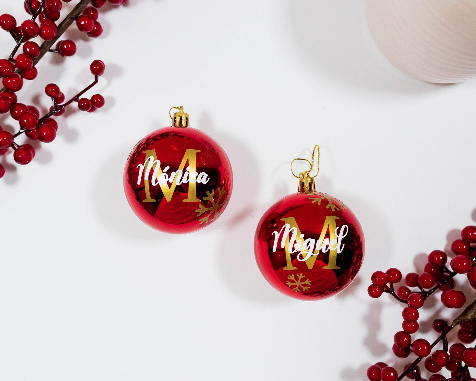 Cada bola está adornada con la inicial en vinilo dorado, el nombre en vinilo blanco y complementado con delicados copos de nieve en vinilo dorado.