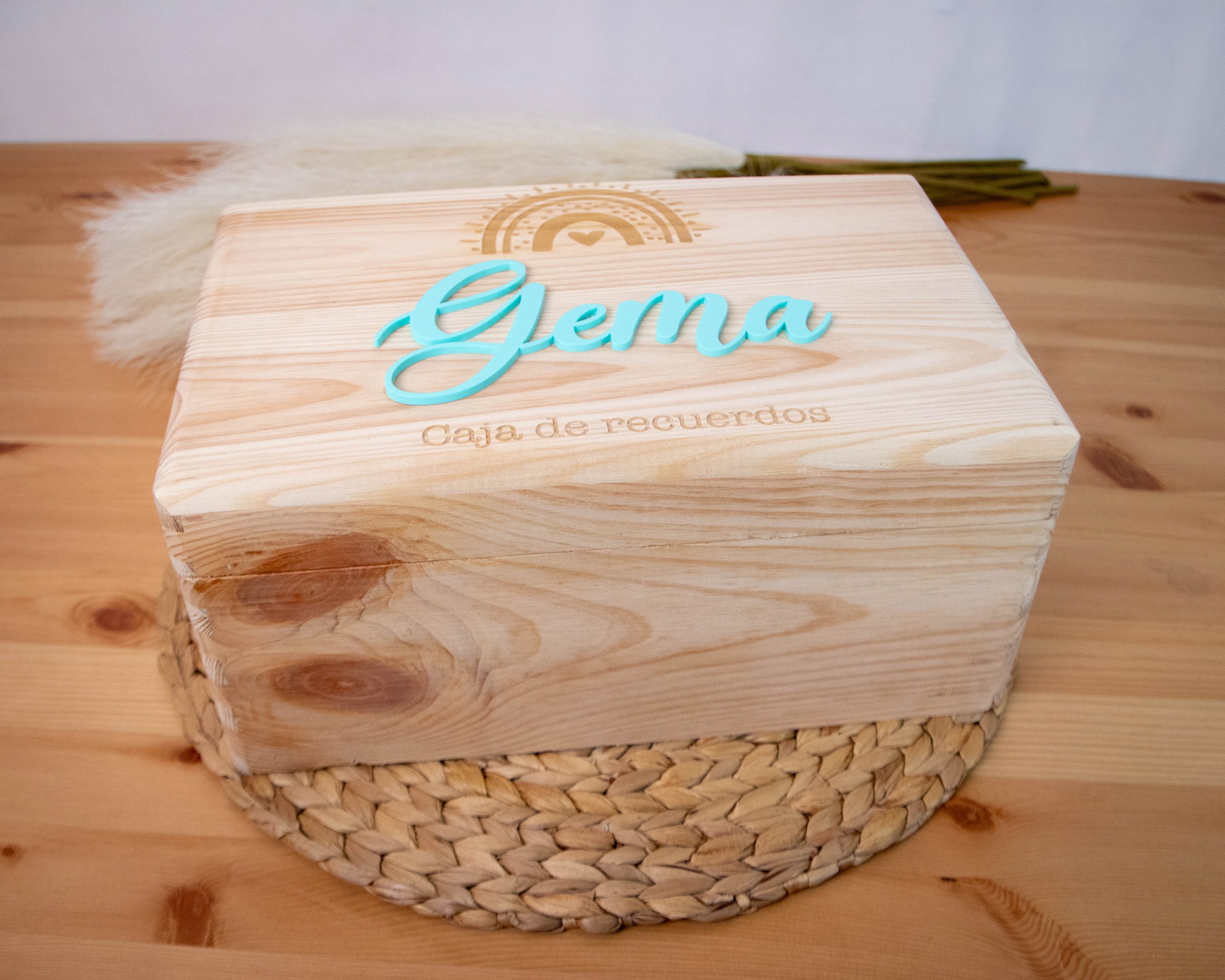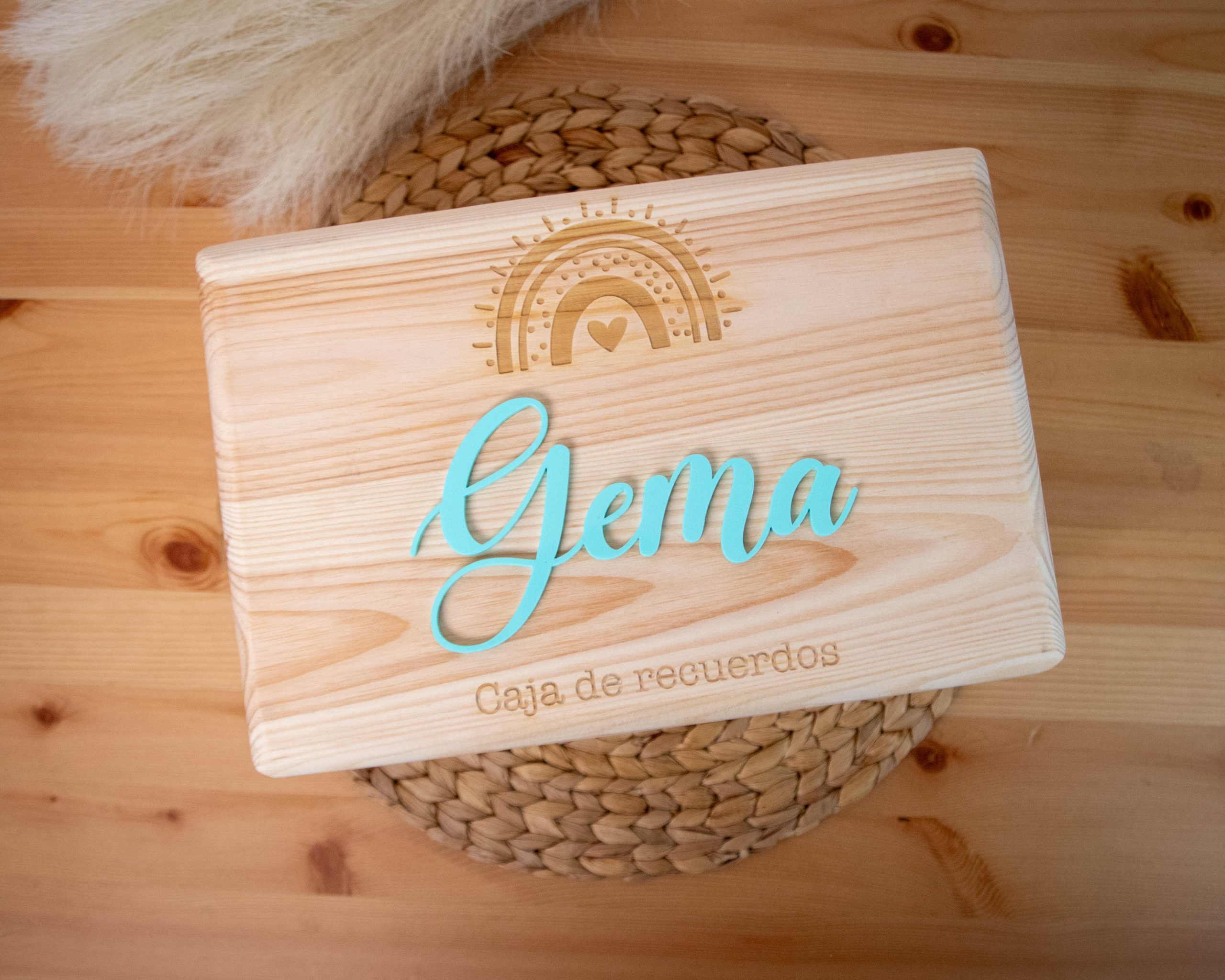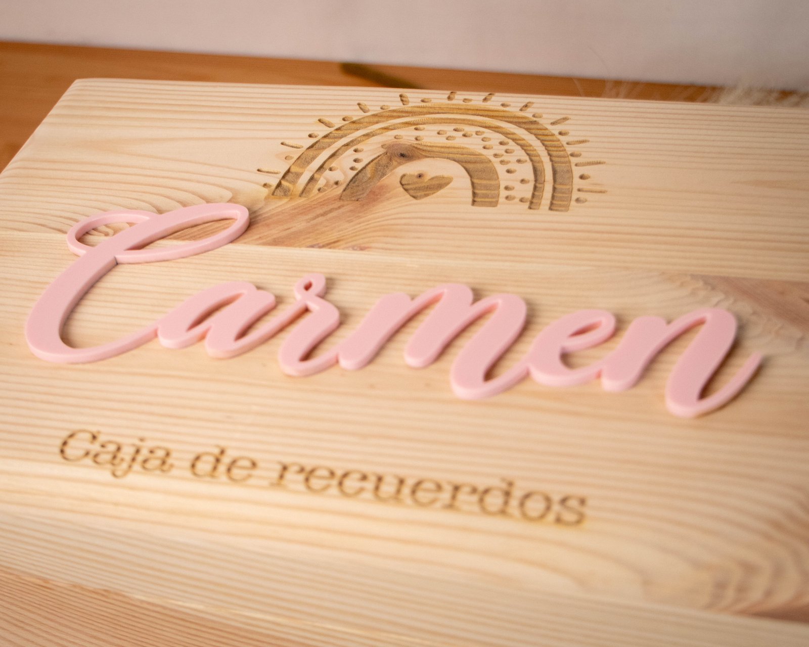 Puedes personalizar la caja con el nombre del bebé en uno de los nueve colores que ofrecemos, para que refleje su estilo y personalidad desde el primer día. Además, puedes grabar en la tapa un mensaje especial, como "Cápsula del tiempo", "Caja de recuerdos", la fecha de nacimiento, o cualquier otro detalle que haga de esta pieza algo verdaderamente memorable.