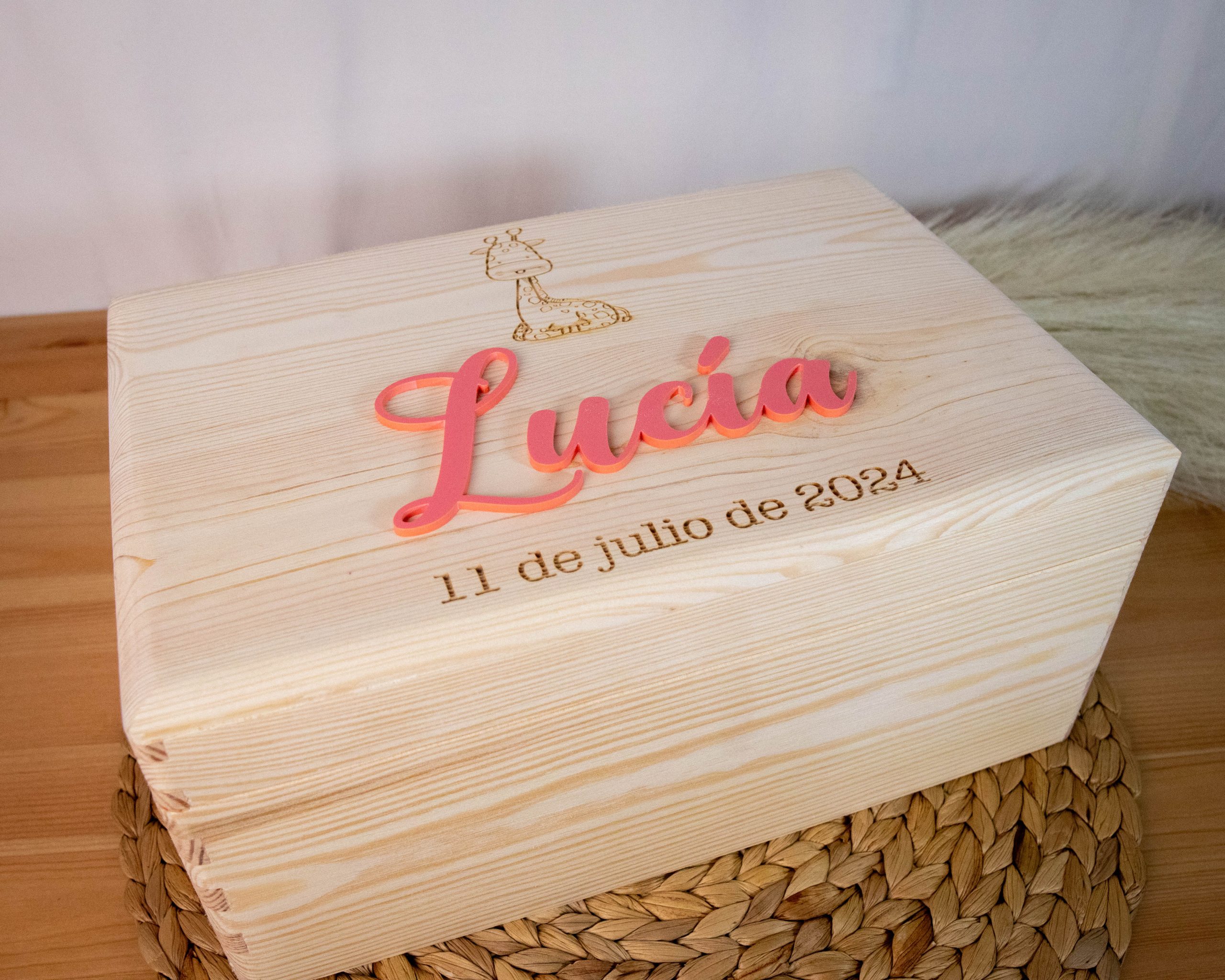 Puedes personalizar la caja con el nombre del bebé en uno de los nueve colores que ofrecemos, para que refleje su estilo y personalidad desde el primer día. Además, puedes grabar en la tapa un mensaje especial, como "Cápsula del tiempo", "Caja de recuerdos", la fecha de nacimiento, o cualquier otro detalle que haga de esta pieza algo verdaderamente memorable.