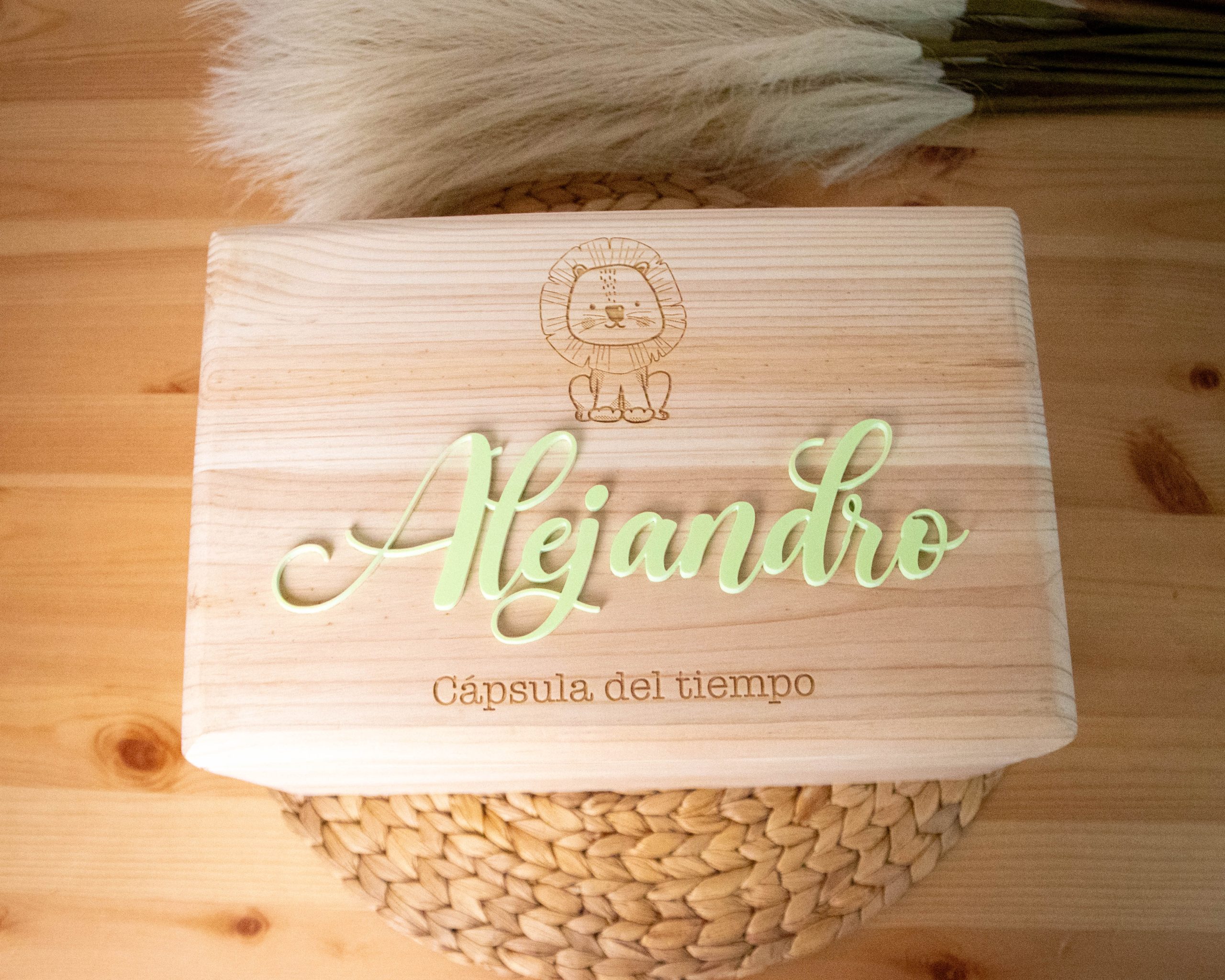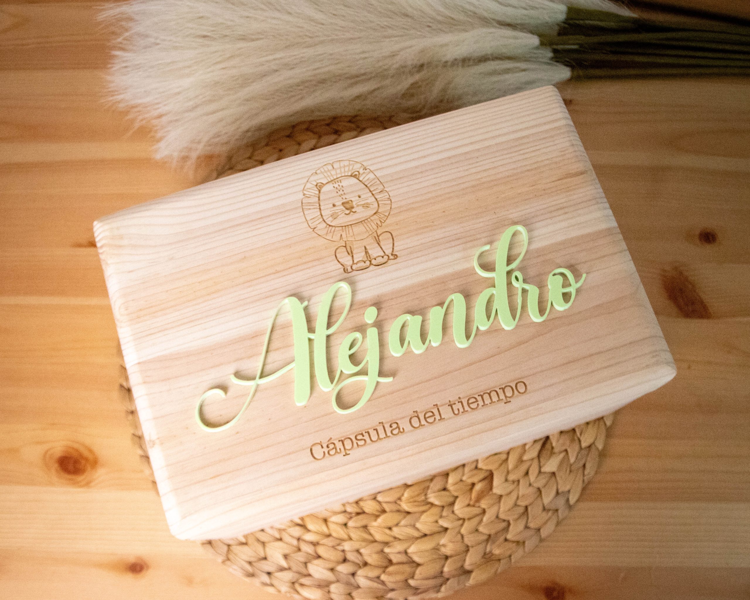 Personaliza una cápsula del tiempo o caja de recuerdos para tu bebé con su nombre y un grabado especial.