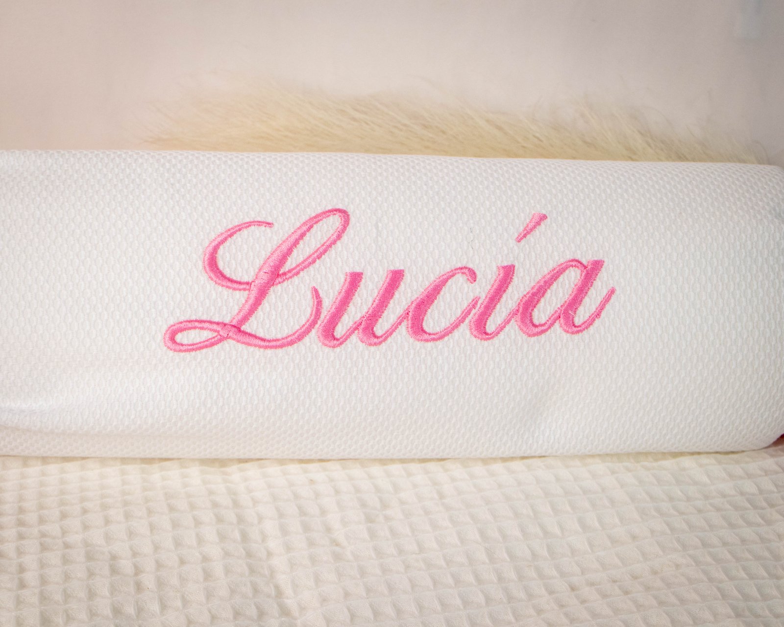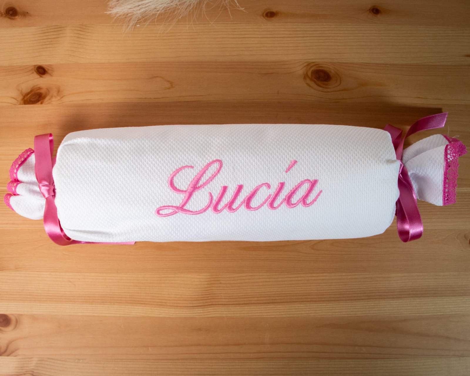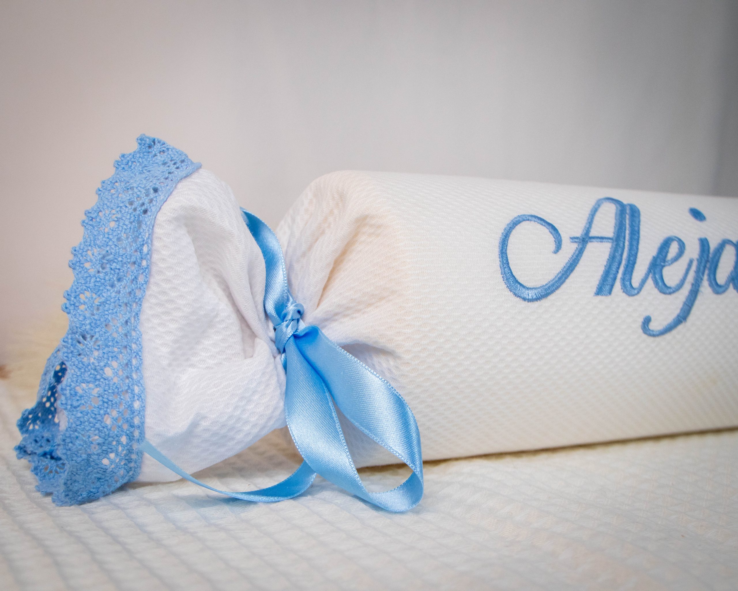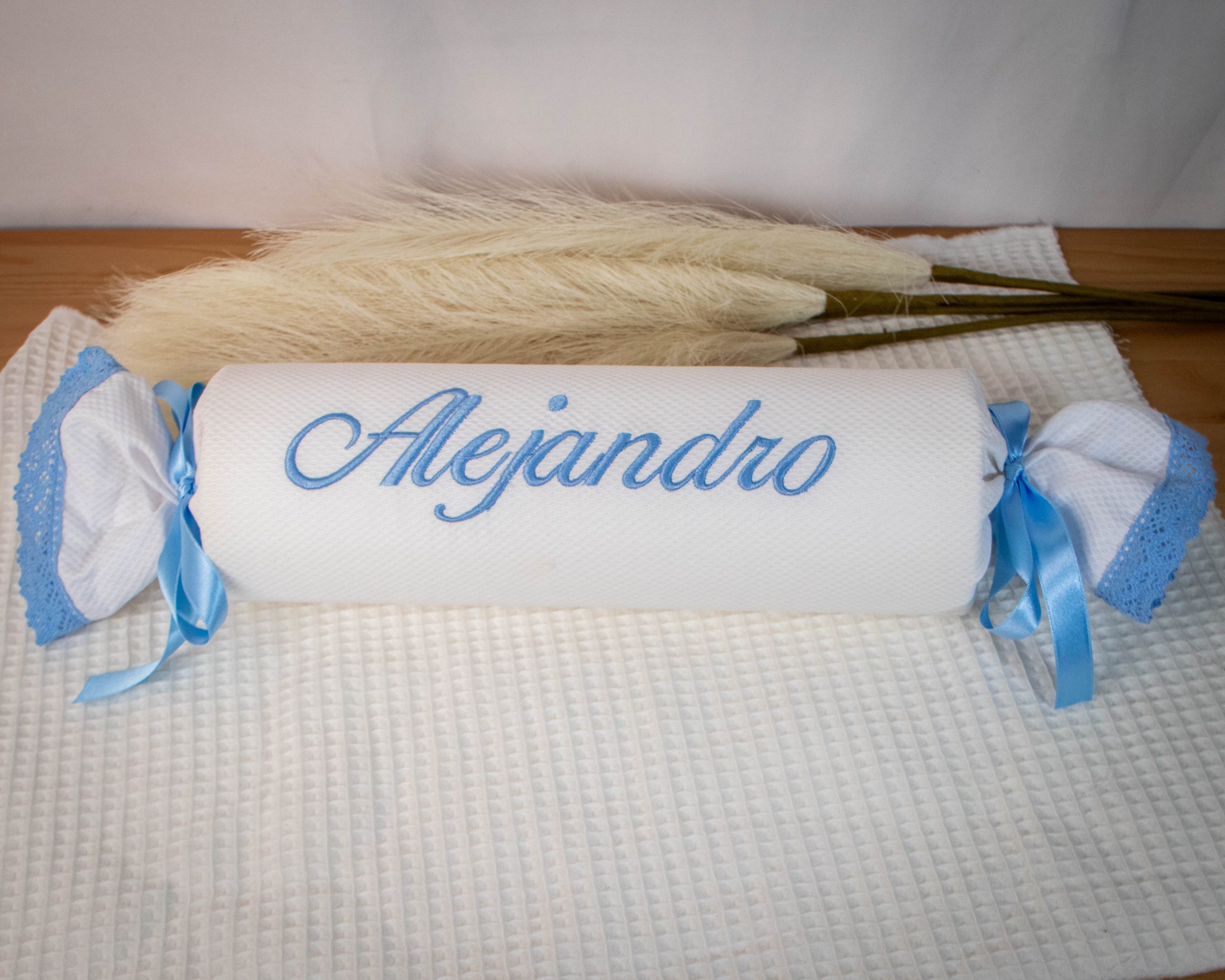 Cojín/Caramelo antivuelco en tela de piqué bordado con su nombre.