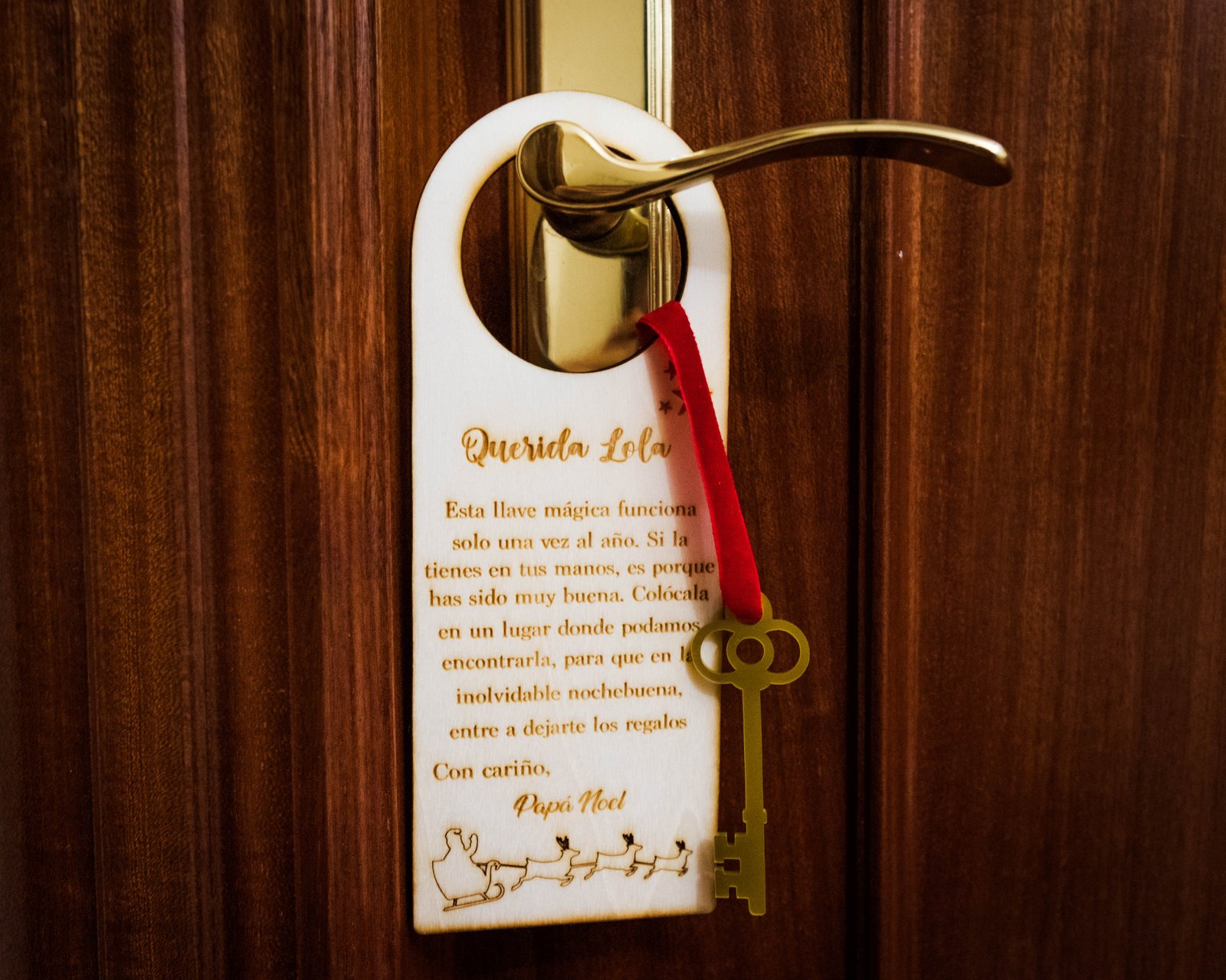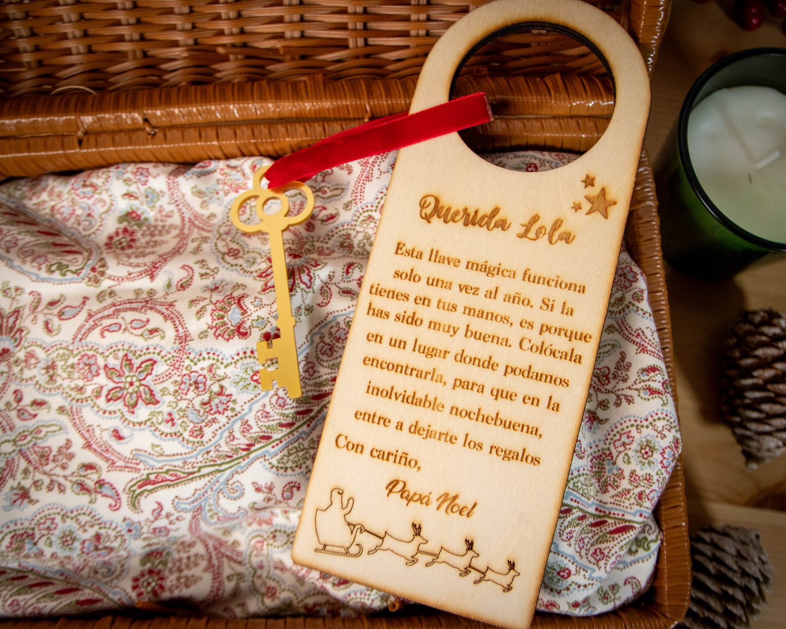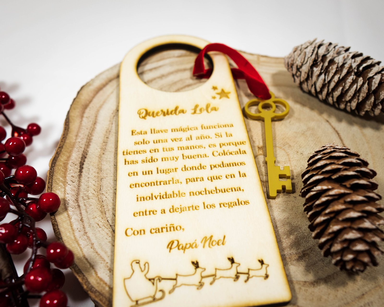 Añade magia a la Navidad con nuestro colgador de puerta personalizado y llave mágica de Papá Noel. Ideal para sorprender a los niños en la víspera de Navidad.