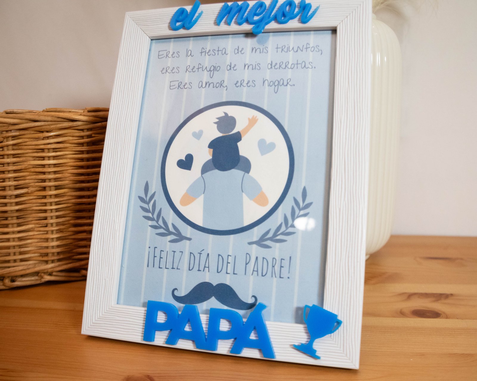 Acompañado de una ilustración conmovedora de un padre con su hijo/a y detalles decorativos como la palabra "Papá" en relieve, una copa y un bigote, este cuadro es ideal para recordarle a diario lo importante que es en tu vida.