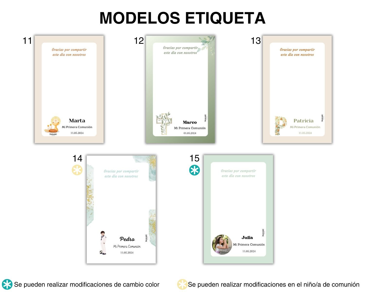 En los diseños de etiqueta, algunos tienen posible variaciones, como cambiar el color del fondo, o el color del pelo del niño o niña de la comunión. Las etiquetas que tienen posibilidad de realizar variaciones están señaladas con asteriscos. Por lo que, si seleccionas una de estas etiquetas debes escribir en la casilla de CARACTERISTICAS, aquellos cambios que deseas realizar.