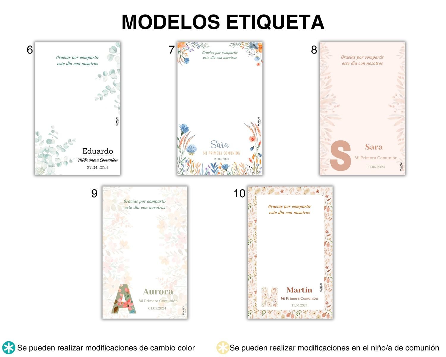 Las etiquetas son totalmente personalizadas con los datos de la comunión. Puedes elegir el modelo que más te guste o una foto y añadir el nombre, la fecha, una frase de la celebración…