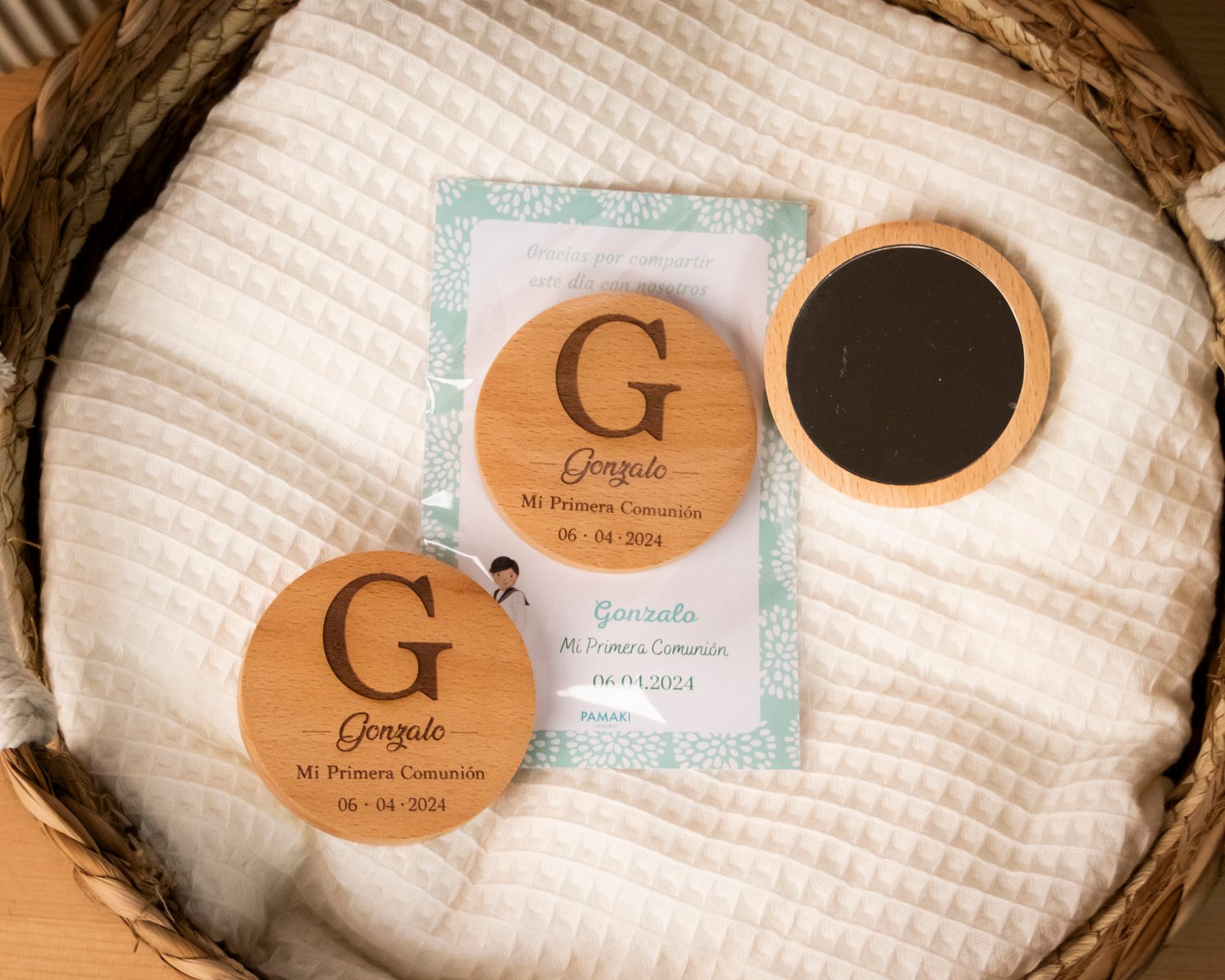 Sorprende a tus invitados con este detalle único como recuerdo de la Primera Comunión de tu peque, un precioso espejo circular en madera. Podrás elegir entre distintos diseños grabados con el nombre del niño/a de la comunión, Mi Primera Comunión y la fecha del evento.