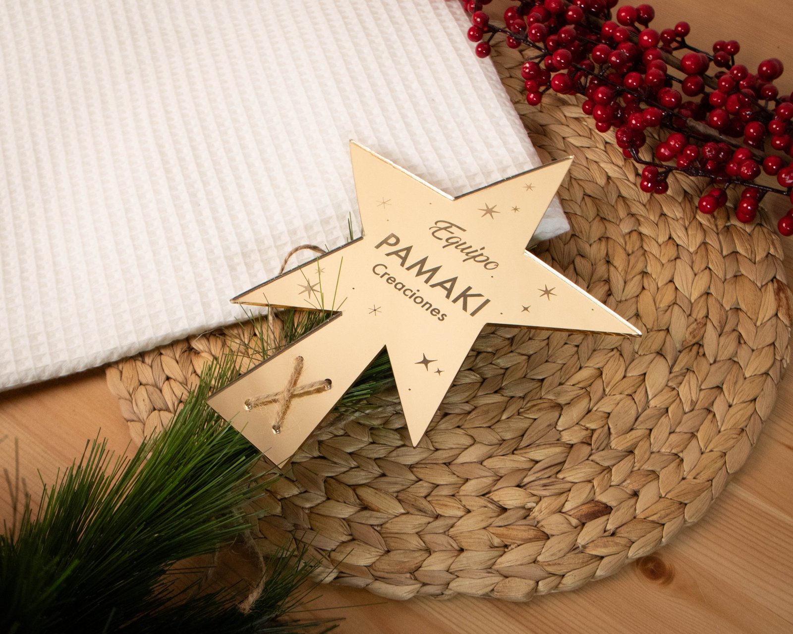 Personaliza tu árbol de Navidad con una estrella de metacrilato espejo dorada grabada con los apellidos de tu familia. Un detalle especial que hará tu decoración aún más mágica.