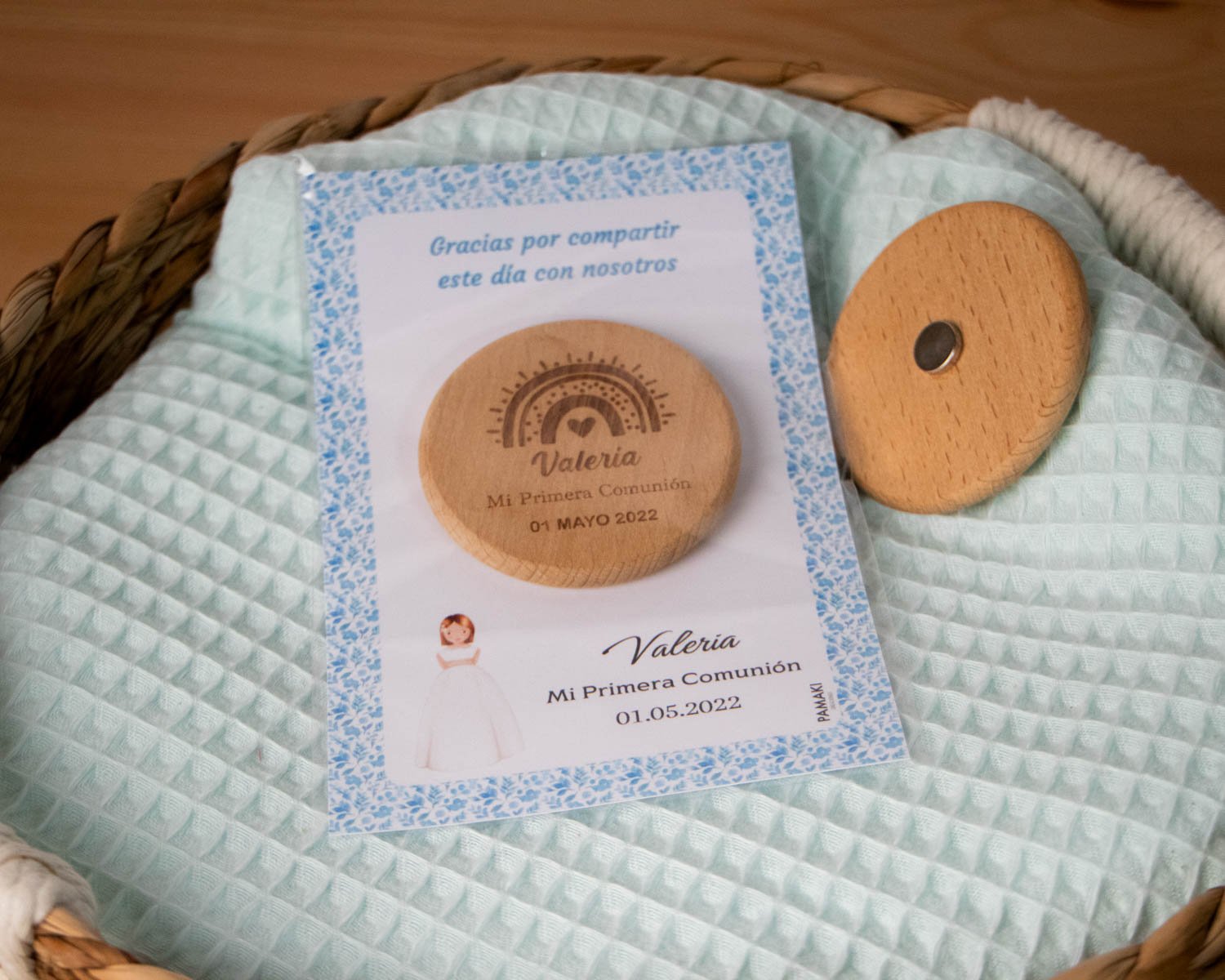 Sorprende a tus invitados con este detalle único como recuerdo de la Primera Comunión de tu peque, un precioso imán circular en madera.
