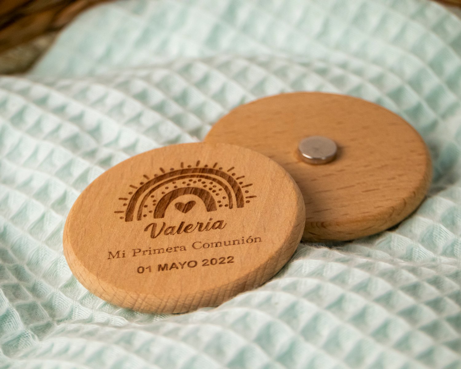 Sorprende a tus invitados con este detalle único como recuerdo de la Primera Comunión de tu peque, un precioso imán circular en madera.