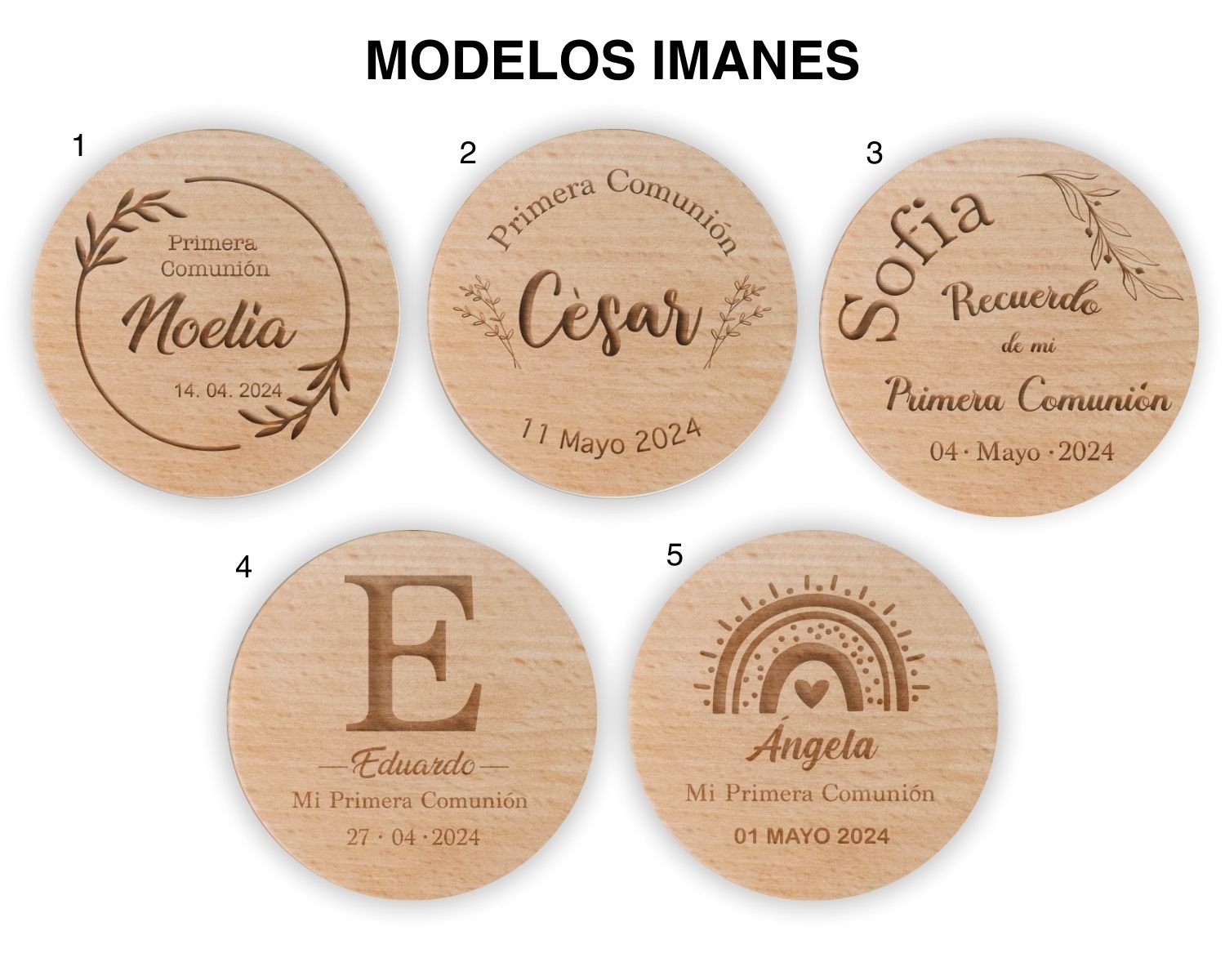 Sorprende a tus invitados con este detalle único como recuerdo de la Primera Comunión de tu peque, un precioso imán circular en madera. Podrás elegir entre distintos diseños grabados con el nombre del niño/a de la comunión, Mi Primera Comunión y la fecha del evento.