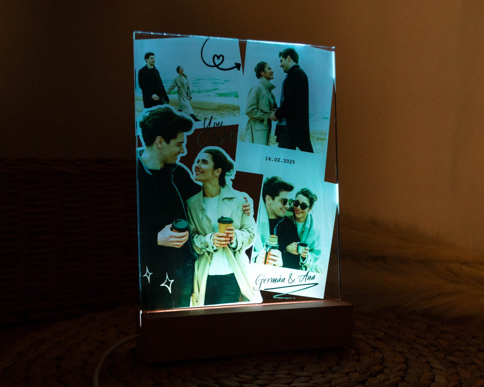 Esta lámpara personalizada es el obsequio ideal para celebrar el amor y recordar esos momentos especiales. Cada vez que se encienda, evocará emociones y recuerdos inolvidables, convirtiéndose en un símbolo de la conexión única entre tú y tu pareja.