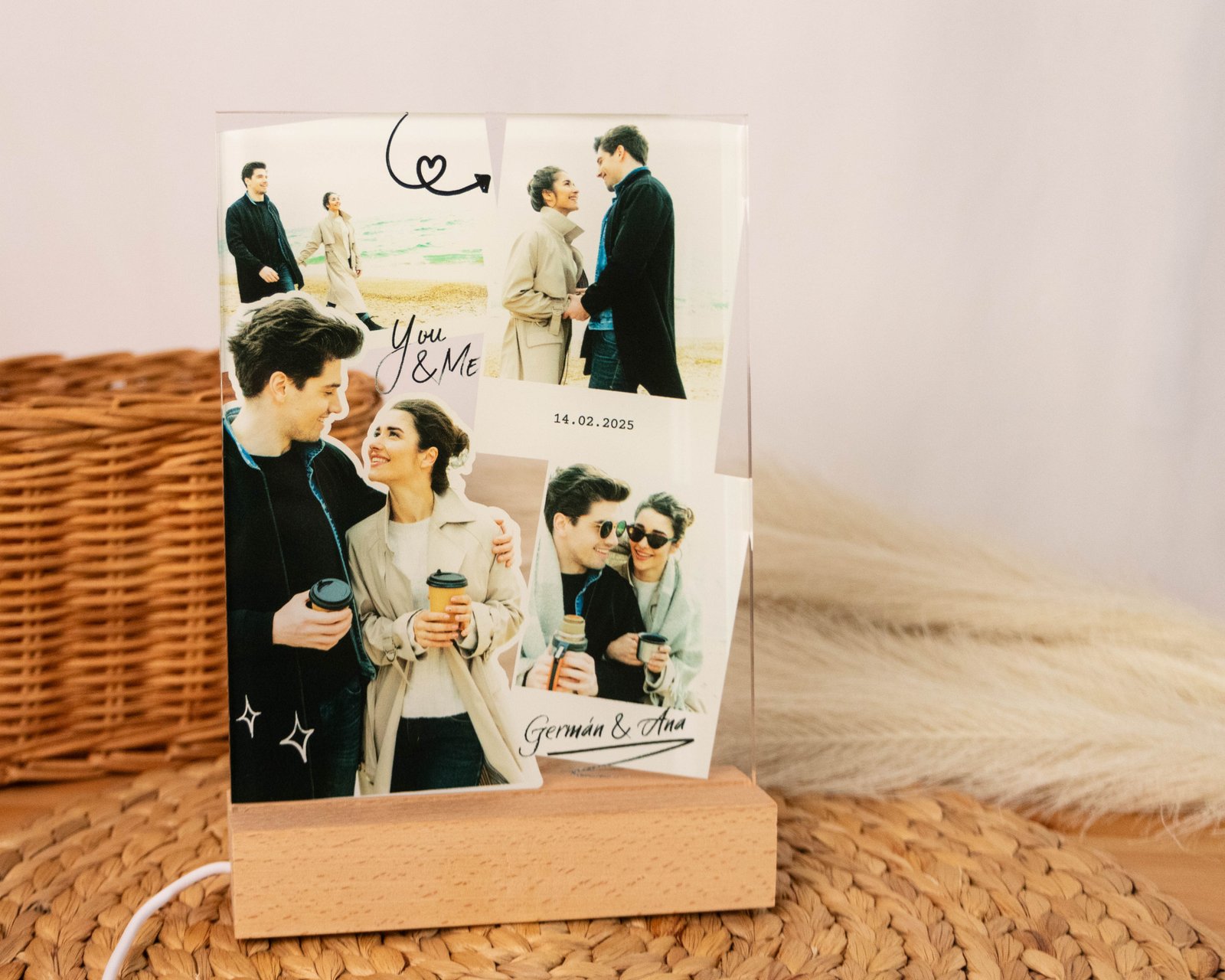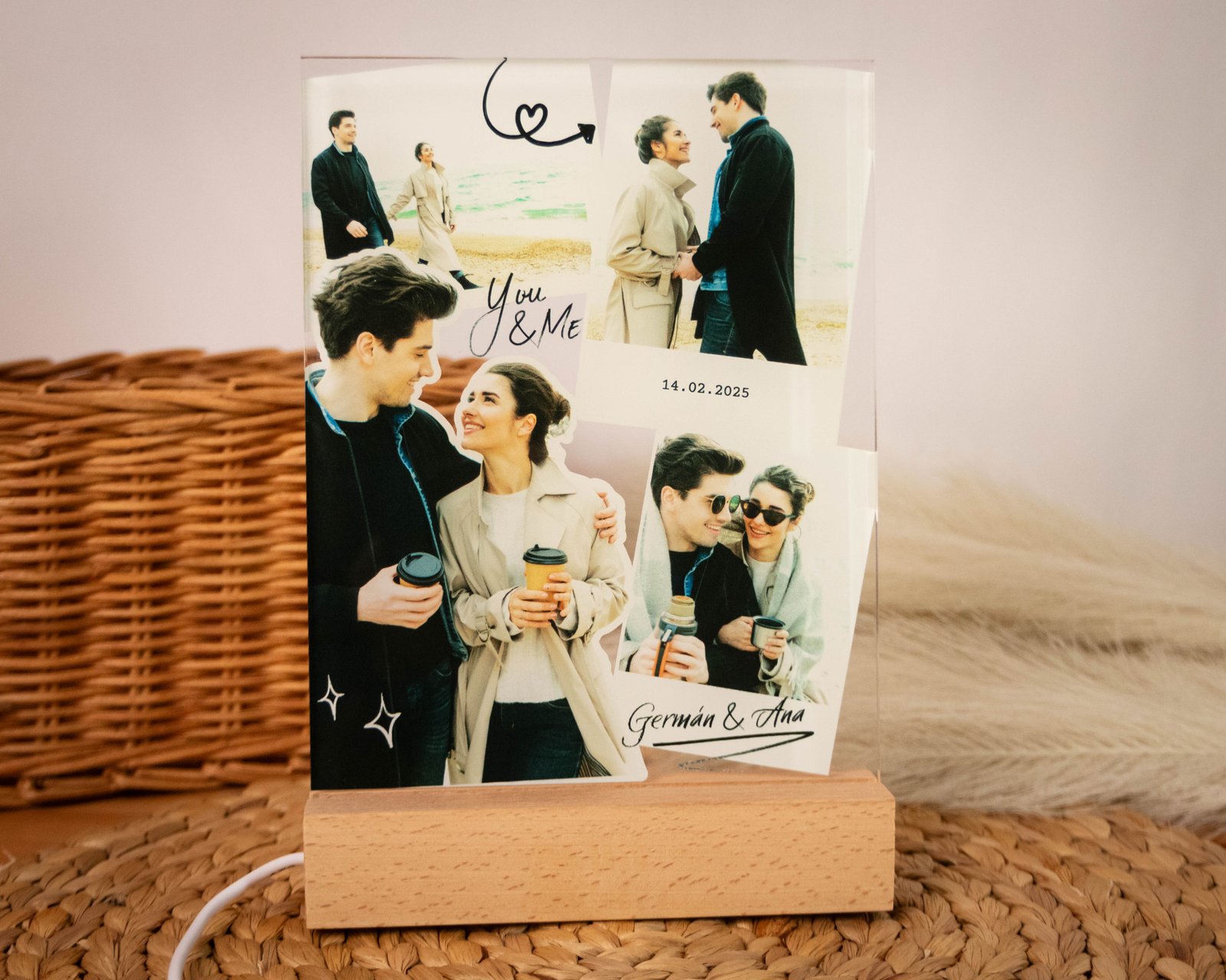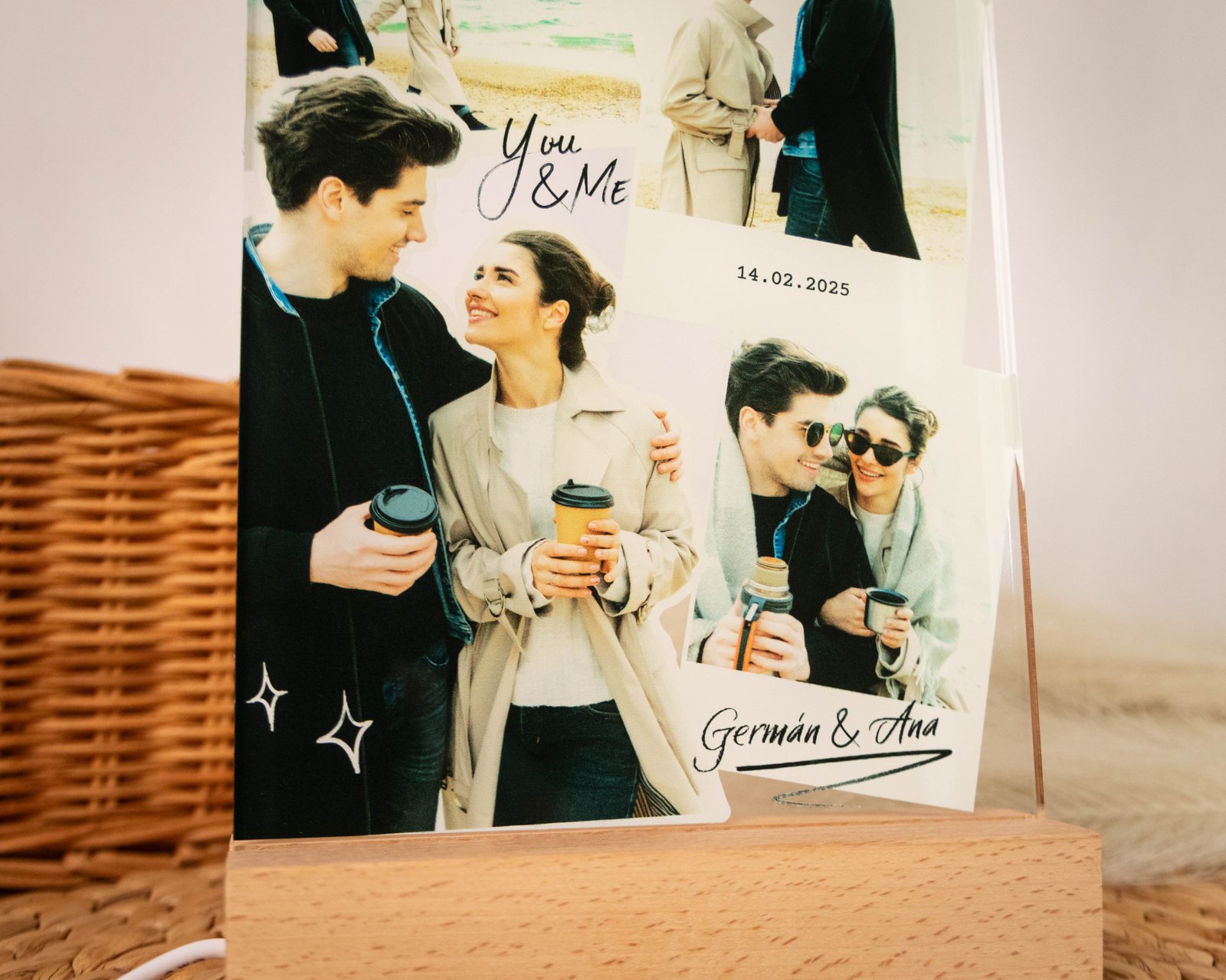 Lámpara Personalizada con Fotos y Mensaje en metacrilato con base de madera. Un regalo único y emotivo para parejas, con luz LED cálida y diferentes diseños a elegir.