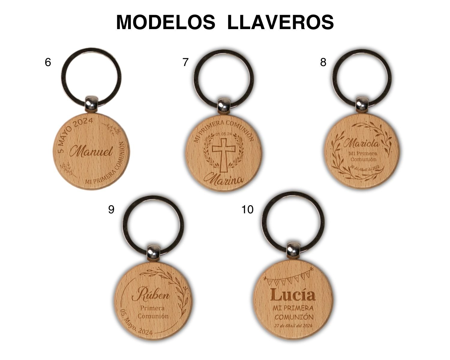 Llaveros circulares en madera grabados. Y etiqueta y bolsita, si seleccionas la opción de recibirlo preparado.