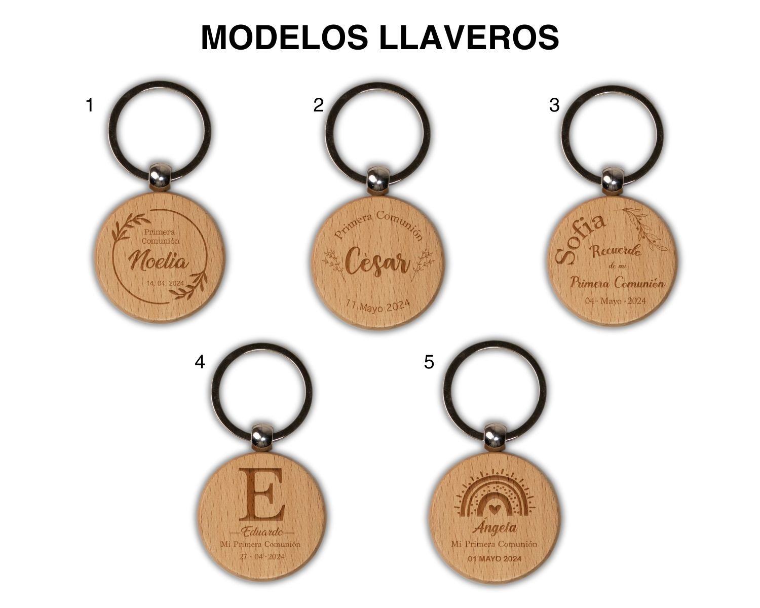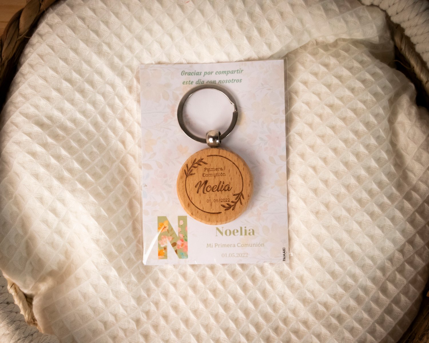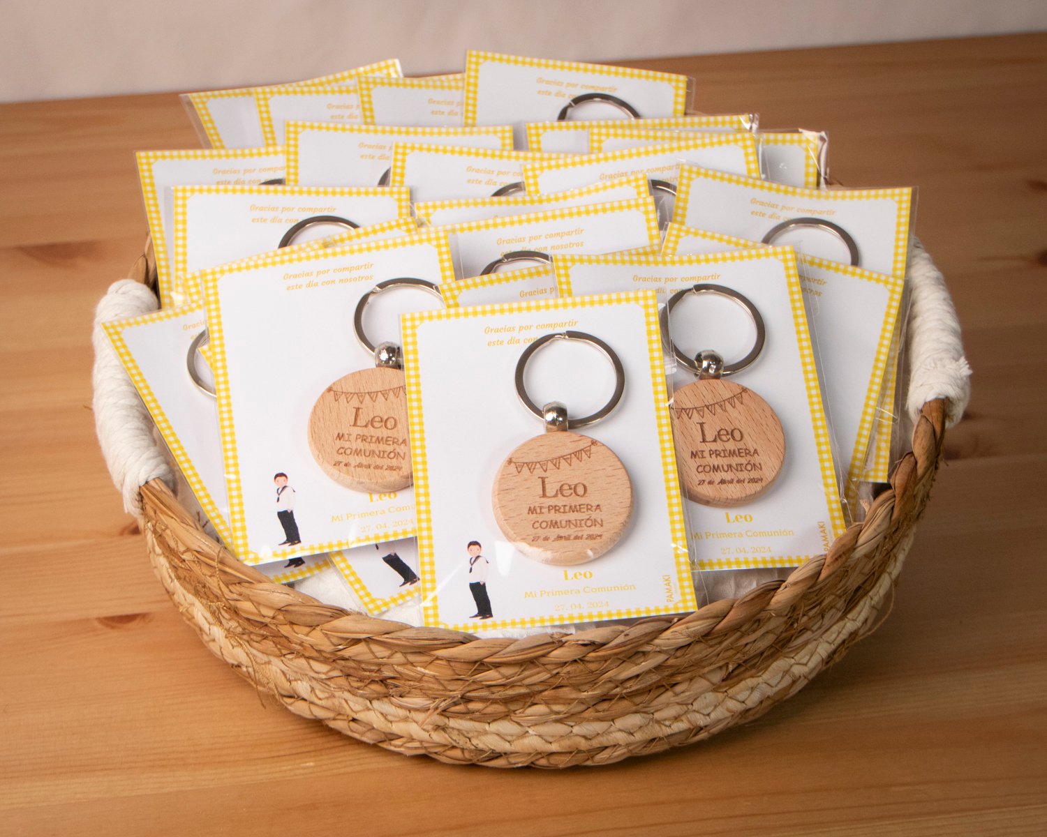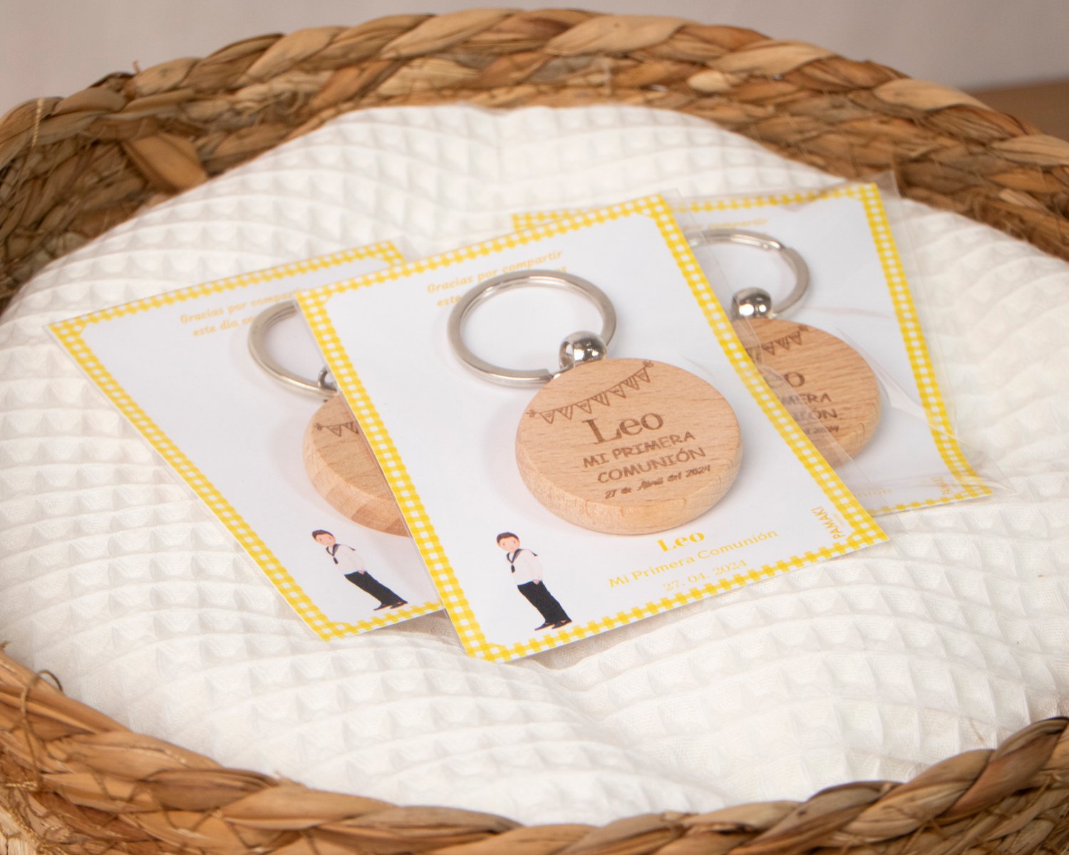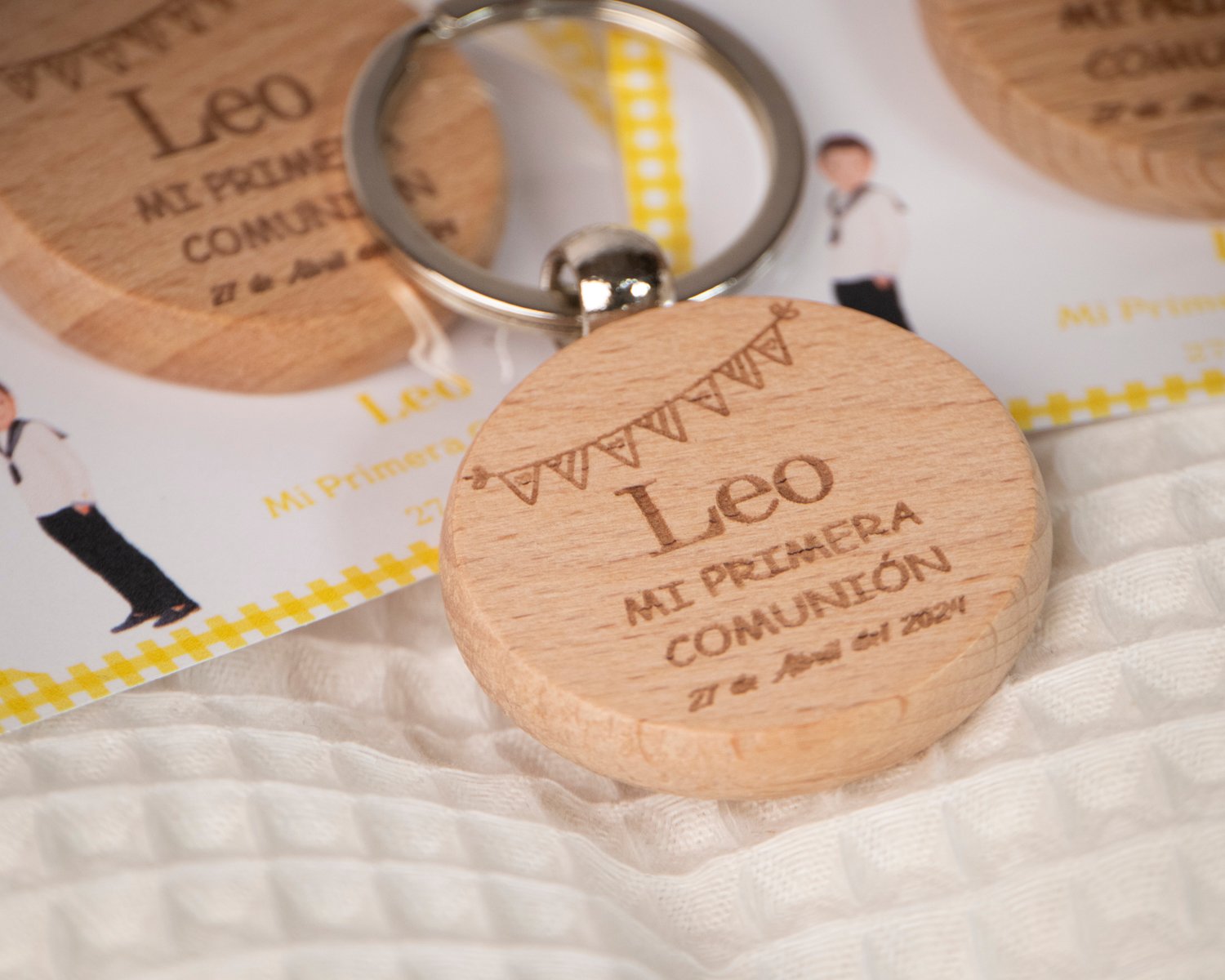 Sorprende a tus invitados con este detalle único como recuerdo de la Primera Comunión de tu peque, un precioso llavero de madera grabado. Podrás elegir entre distintos diseños grabados con el nombre del niño/a de la comunión, Mi Primera Comunión y la fecha del evento.