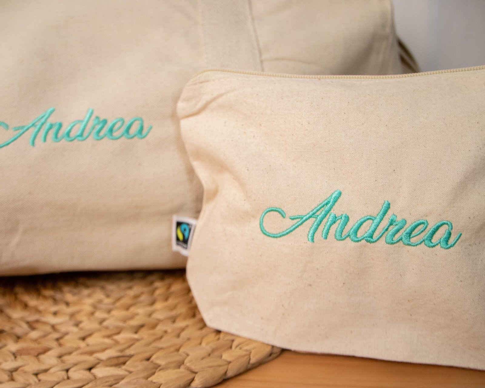 Beneficios del set Maleta Natura + Neceser: Doble funcionalidad: Maleta espaciosa + neceser compacto para mayor organización. Material ecológico: Confeccionados en algodón orgánico de alta calidad y producción sostenible. Personalización exclusiva: Bordado con tu nombre o iniciales en el color que elijas. Diseño práctico y elegante: Perfecto para cualquier tipo de viaje, desde escapadas cortas hasta aventuras más largas. Ideal para regalos: Un detalle único y especial para sorprender a alguien especial.