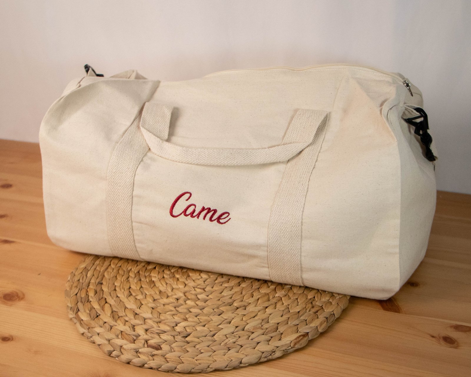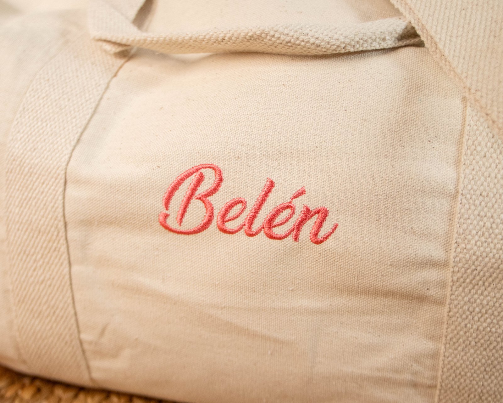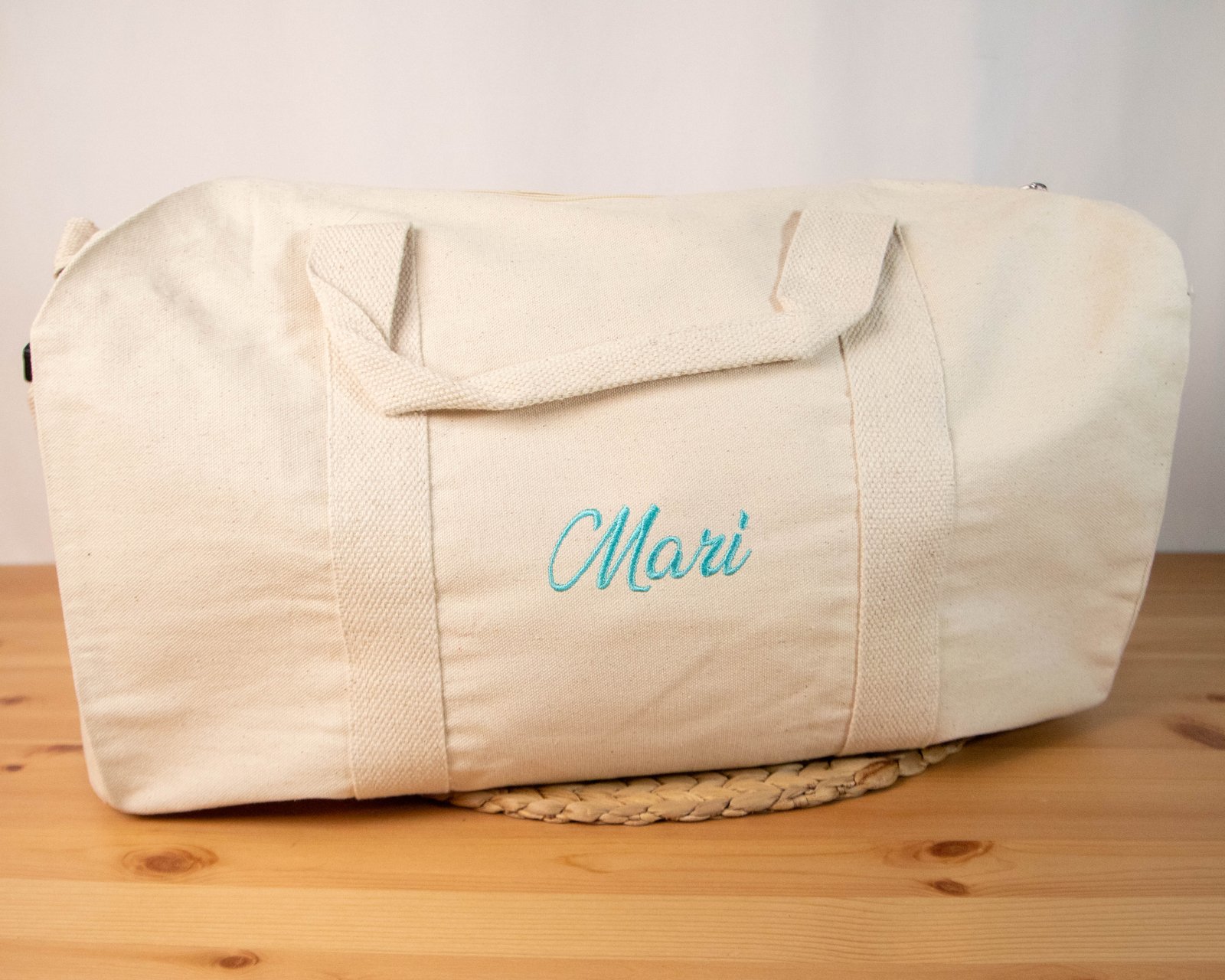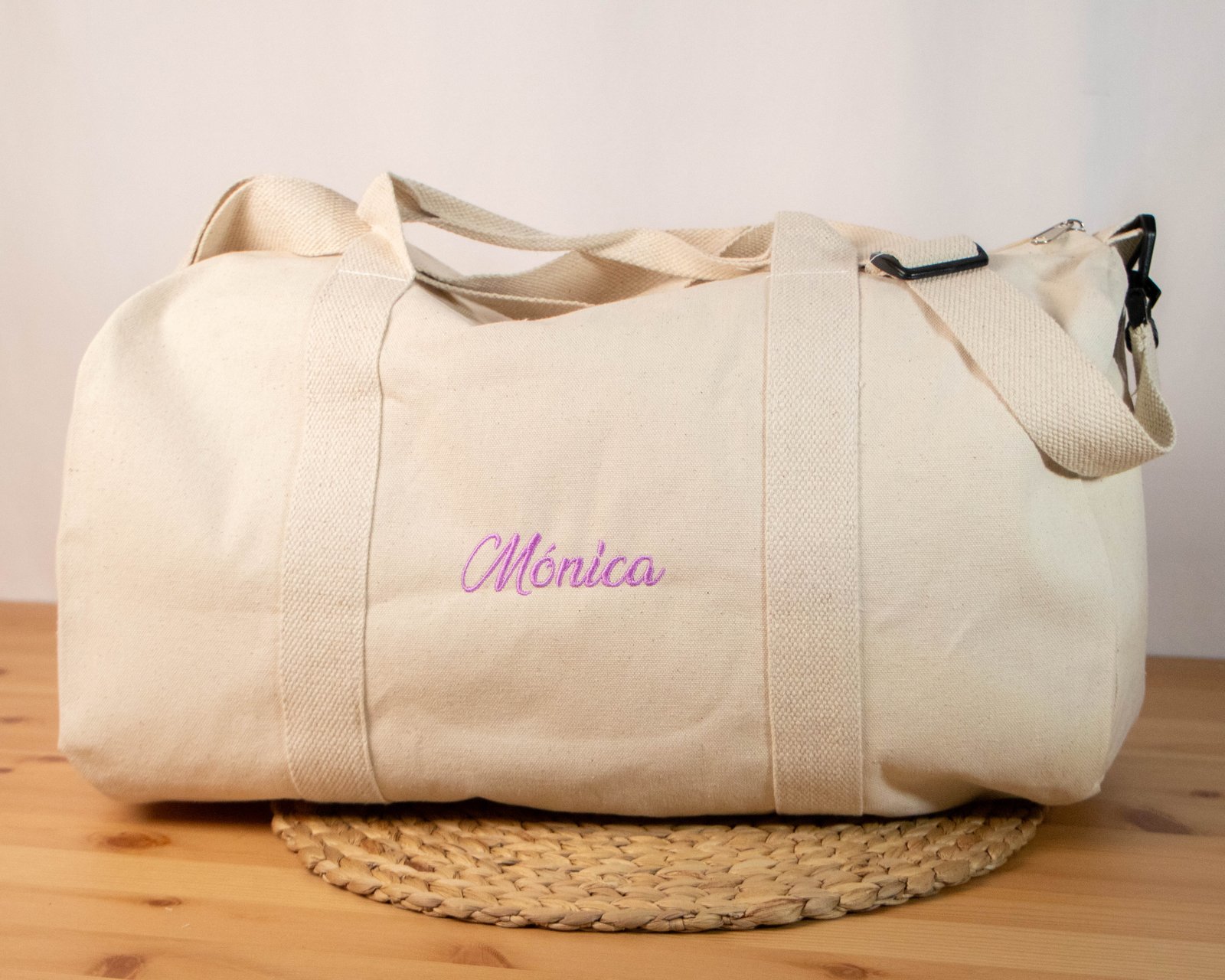 Características destacadas: Material sostenible: Fabricada en algodón reciclado certificado, respetuoso con el medio ambiente. Diseño espacioso y funcional: Amplio compartimento principal con cierre seguro. Comodidad y resistencia: Asas reforzadas y correa ajustable para llevarla al hombro o en la mano. Personalización exclusiva: Bordado con tu nombre o iniciales en el color de tu preferencia. Versatilidad para cualquier ocasión: Perfecta para viajes cortos, gimnasio, escapadas de fin de semana o uso diario.
