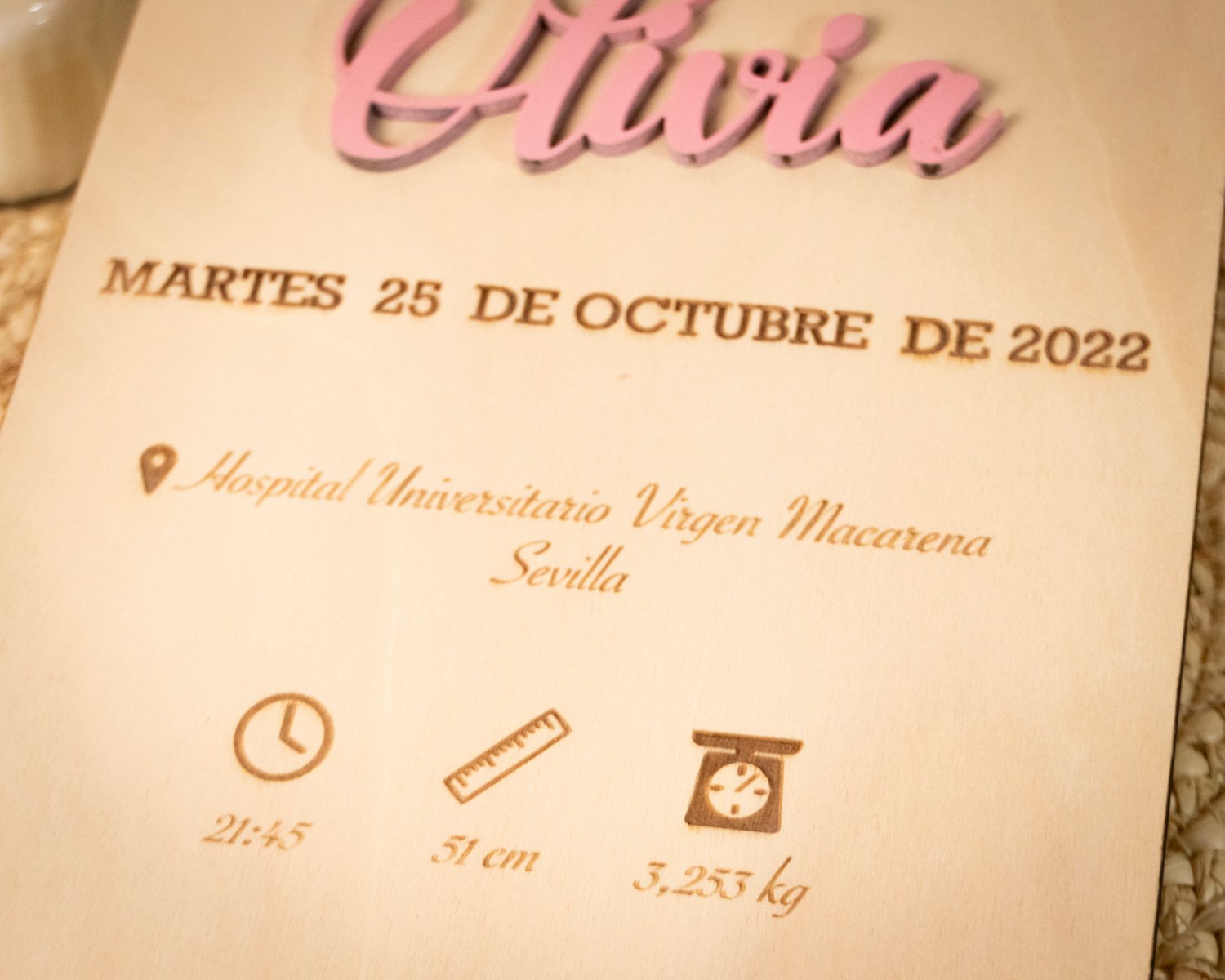 ¿Te gustaría tener un bonito recuerdo del día en el que nació tu bebé? En este precioso natalicio de madera grabada podrás poner todos los datos del nacimiento del peque de la casa, es un recuerdo ideal y perfecto para la decoración de su cuarto. Es totalmente personalizado, con el nombre, fecha de nacimiento, lugar, hora, altura y peso de tu bebé. ¡Os va a enamorar poder recordar para siempre los detalles de la llegada de tu peque!