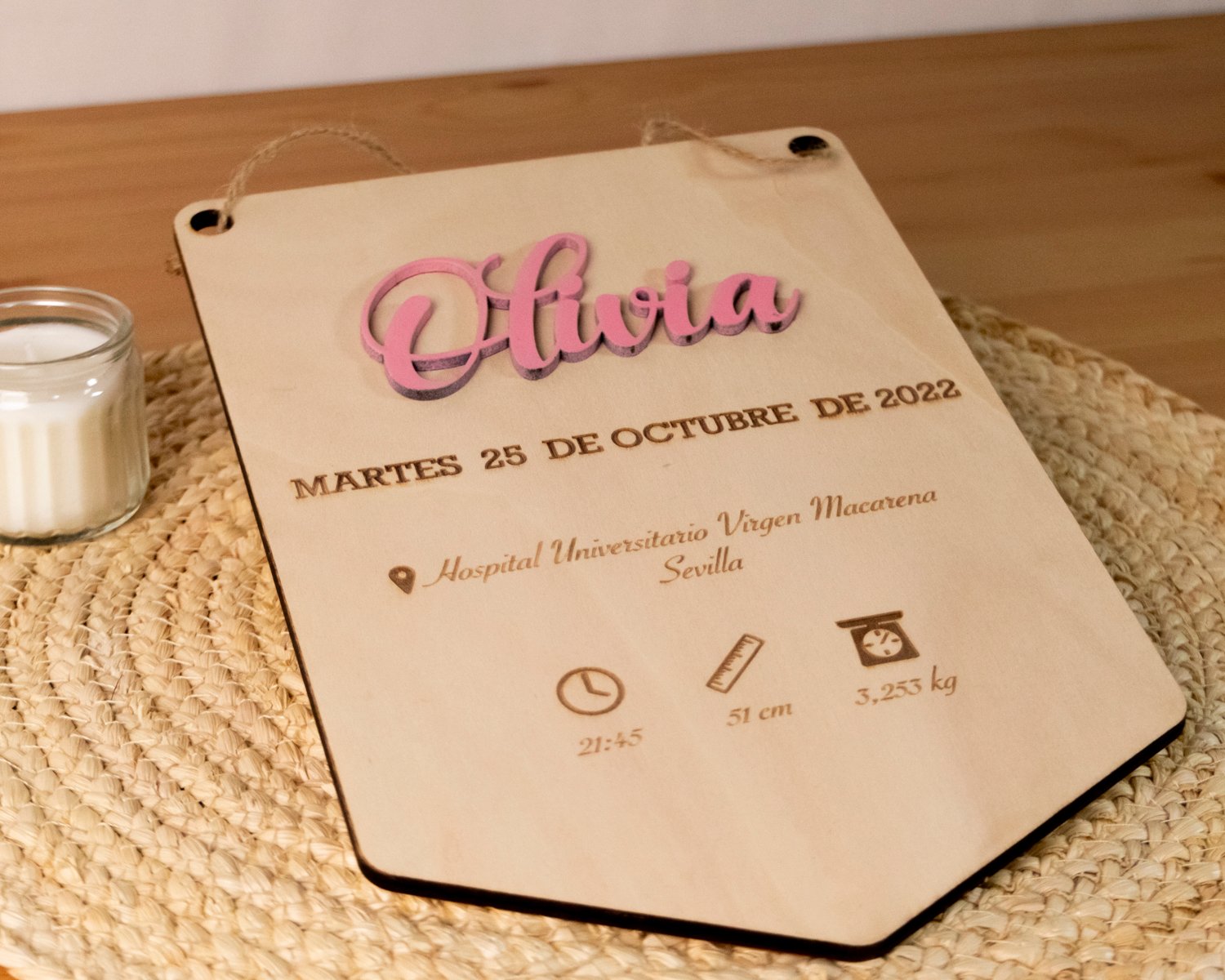 ¿Te gustaría tener un bonito recuerdo del día en el que nació tu bebé? En este precioso natalicio de madera grabada podrás poner todos los datos del nacimiento del peque de la casa, es un recuerdo ideal y perfecto para la decoración de su cuarto.