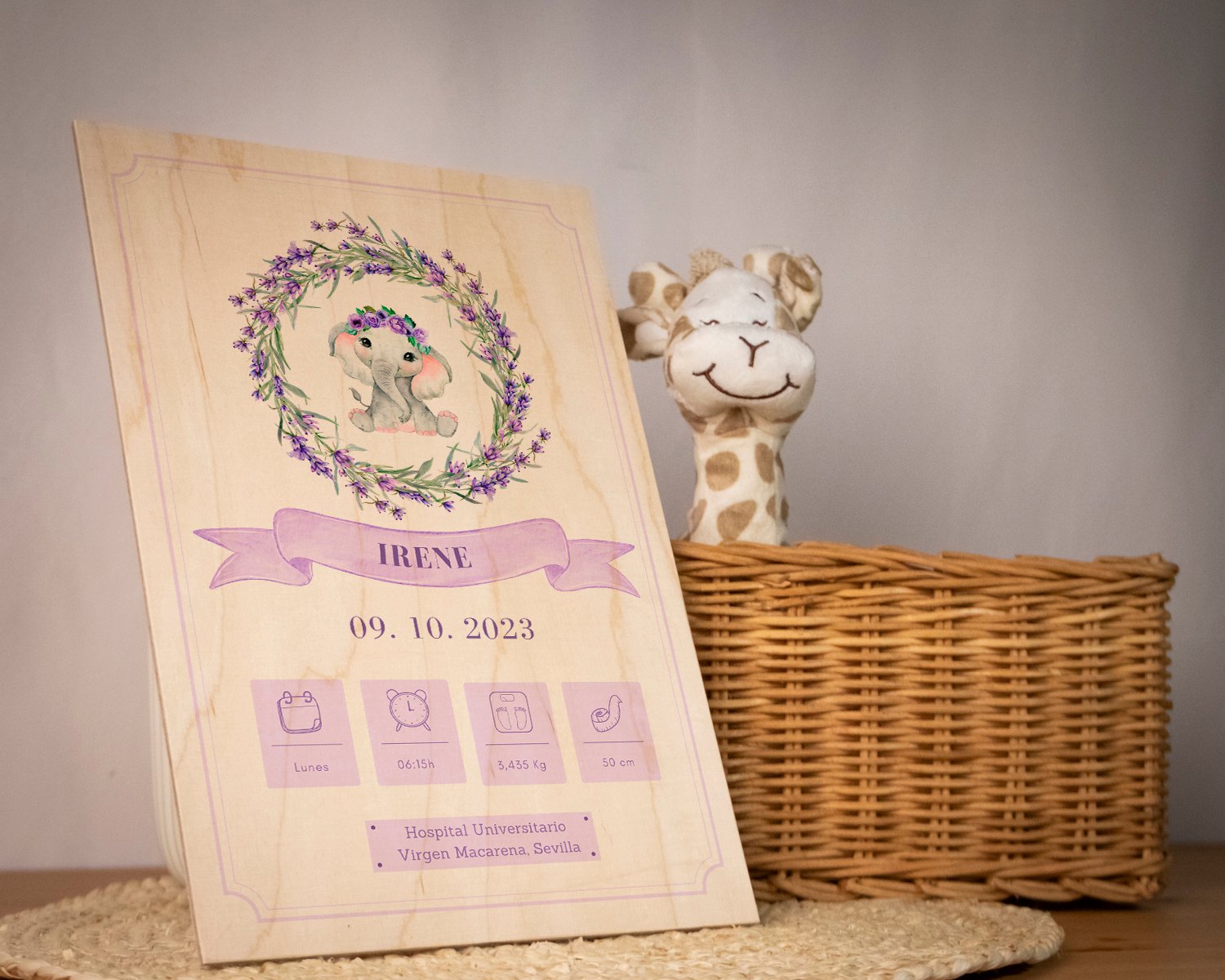 Natalicio sublimado con dibujo Elefanta Lavanda, nombre, fecha de nacimiento, día de la semana, hora, peso, altura y lugar de nacimiento con una base de metacrilato para colocarlo.