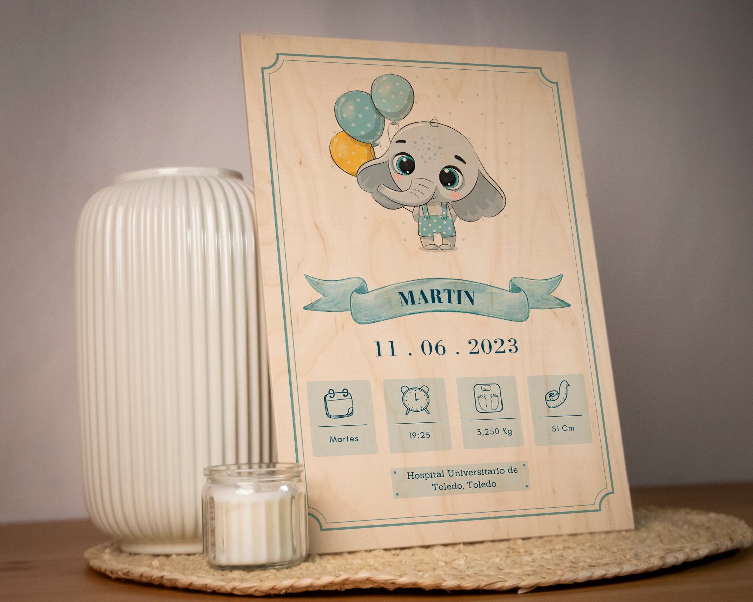 Natalicio sublimado con dibujo Elefante Fiesta, nombre, fecha de nacimiento, día de la semana, hora, peso, altura y lugar de nacimiento con una base de metacrilato para colocarlo.