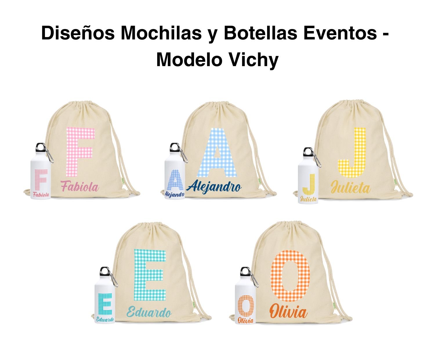 Sorprende a tus invitados más peques con este pack súper molón de botella y mochila con el nombre de cada uno.