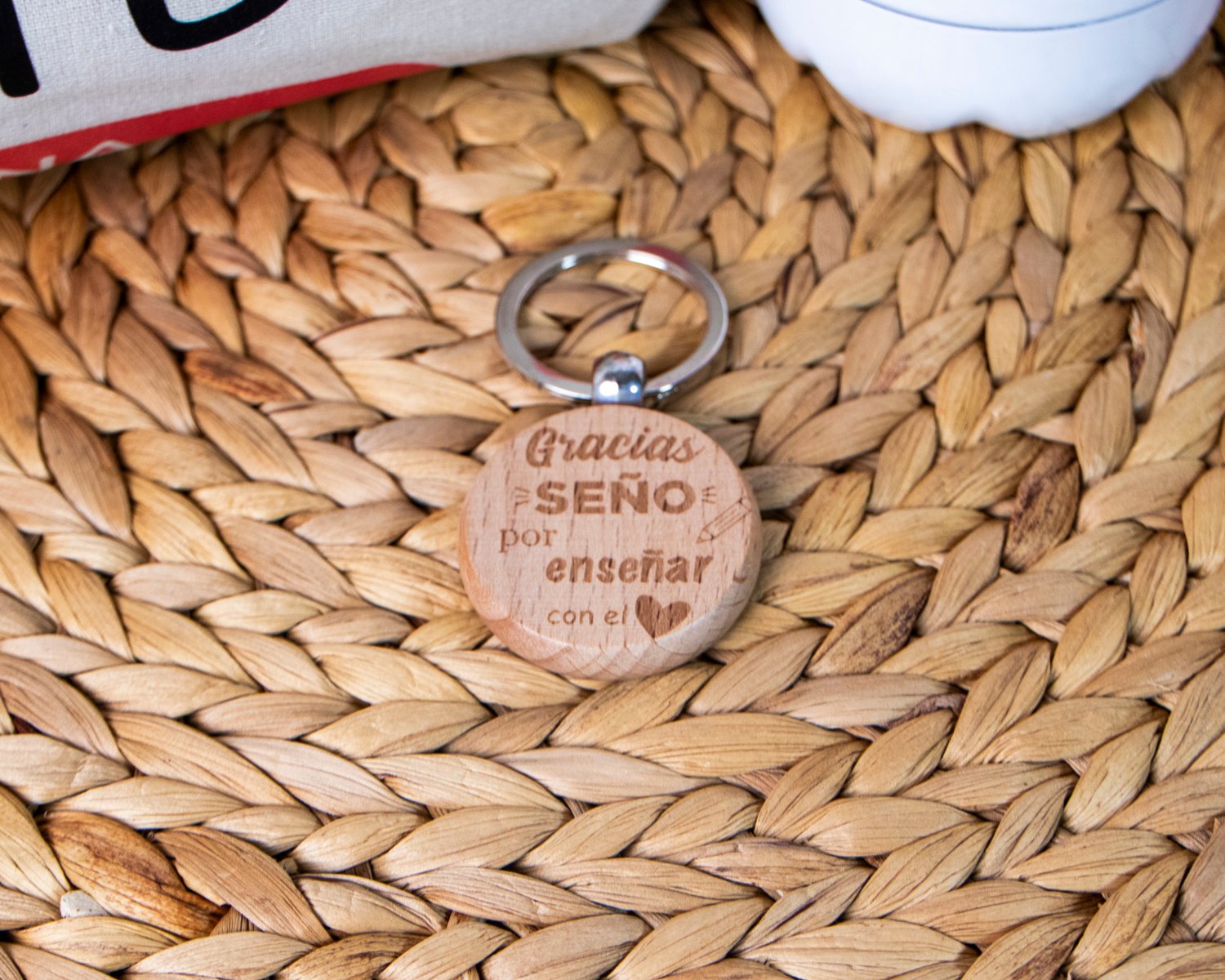 – Llavero de madera grabado a una cara la frase y en la otra el nombre de la seño