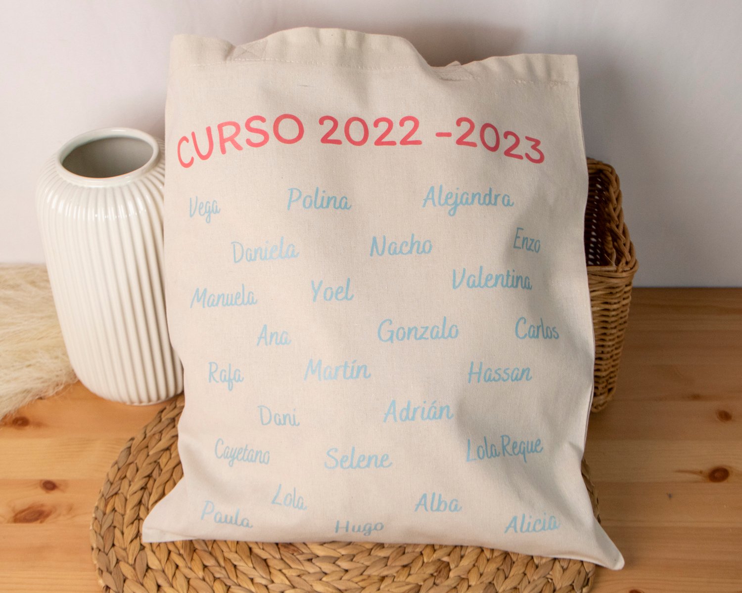 Este regalo es personalizable con el nombre de la seño, maestra o profe, además, puedes añadir en la parte trasera de la Tote Bag, el curso y lo nombres de los alumnos (+5,00€).