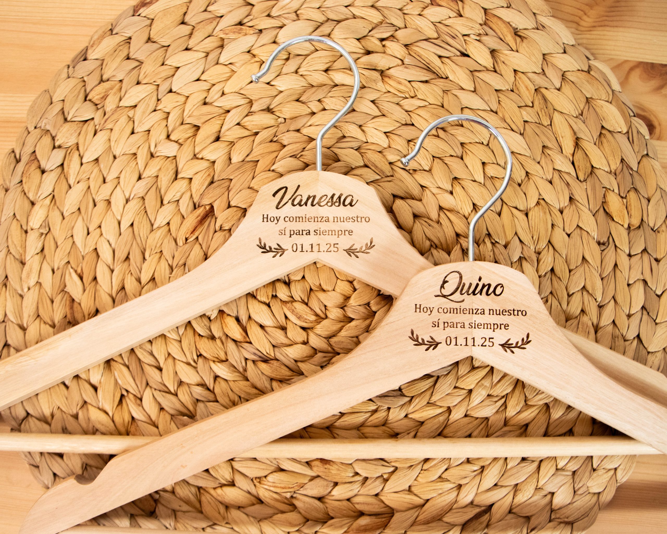 Fabricadas en madera natural de alta calidad y con un gancho metálico resistente, estas perchas no solo son funcionales, sino que se convierten en un recuerdo inolvidable. Cada percha se graba a láser de forma precisa y permanente. Puedes personalizarlas con: