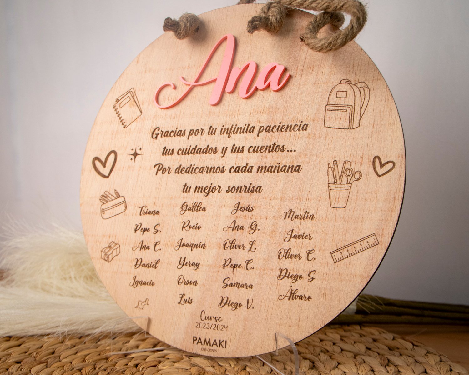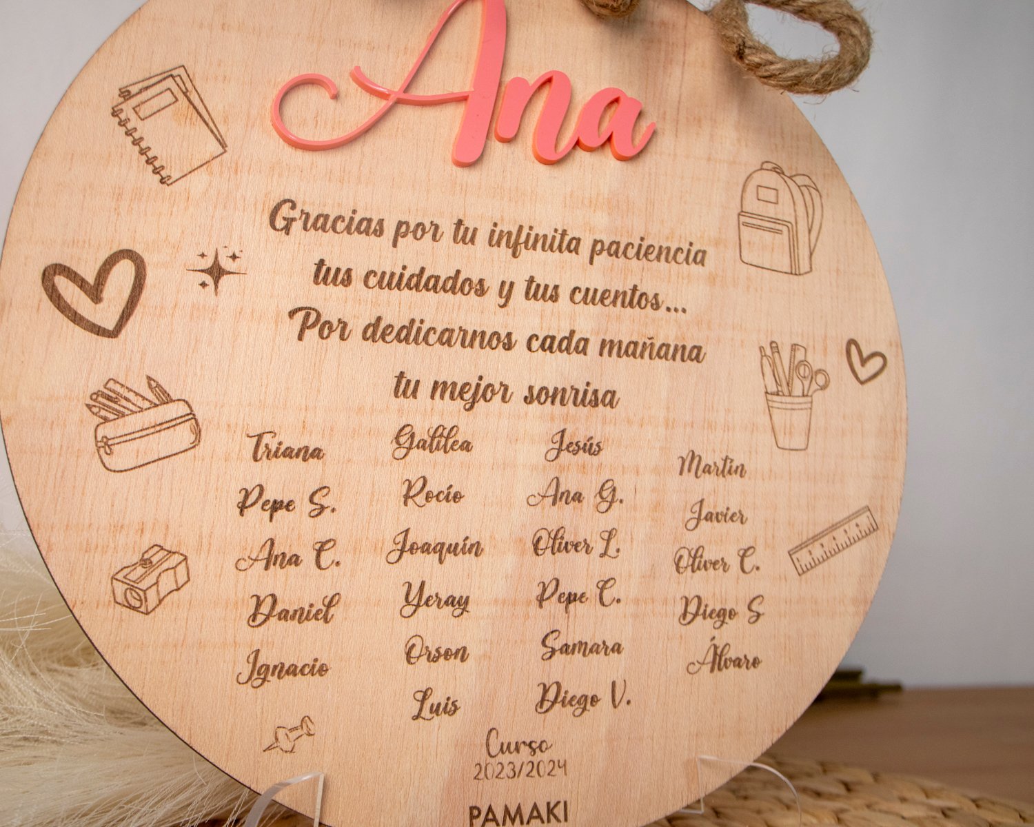 Tener un detalle para tu profe cuando termina el curso ¡siempre es bien! Después de todo un año cuidando y educando a los más peques, se merecen lo mejor. ¿Y qué mejor que una placa profe de madera grabada con los nombres de sus alumnos? Porque es fin de curso y queremos darle las gracias por todo lo aprendido.