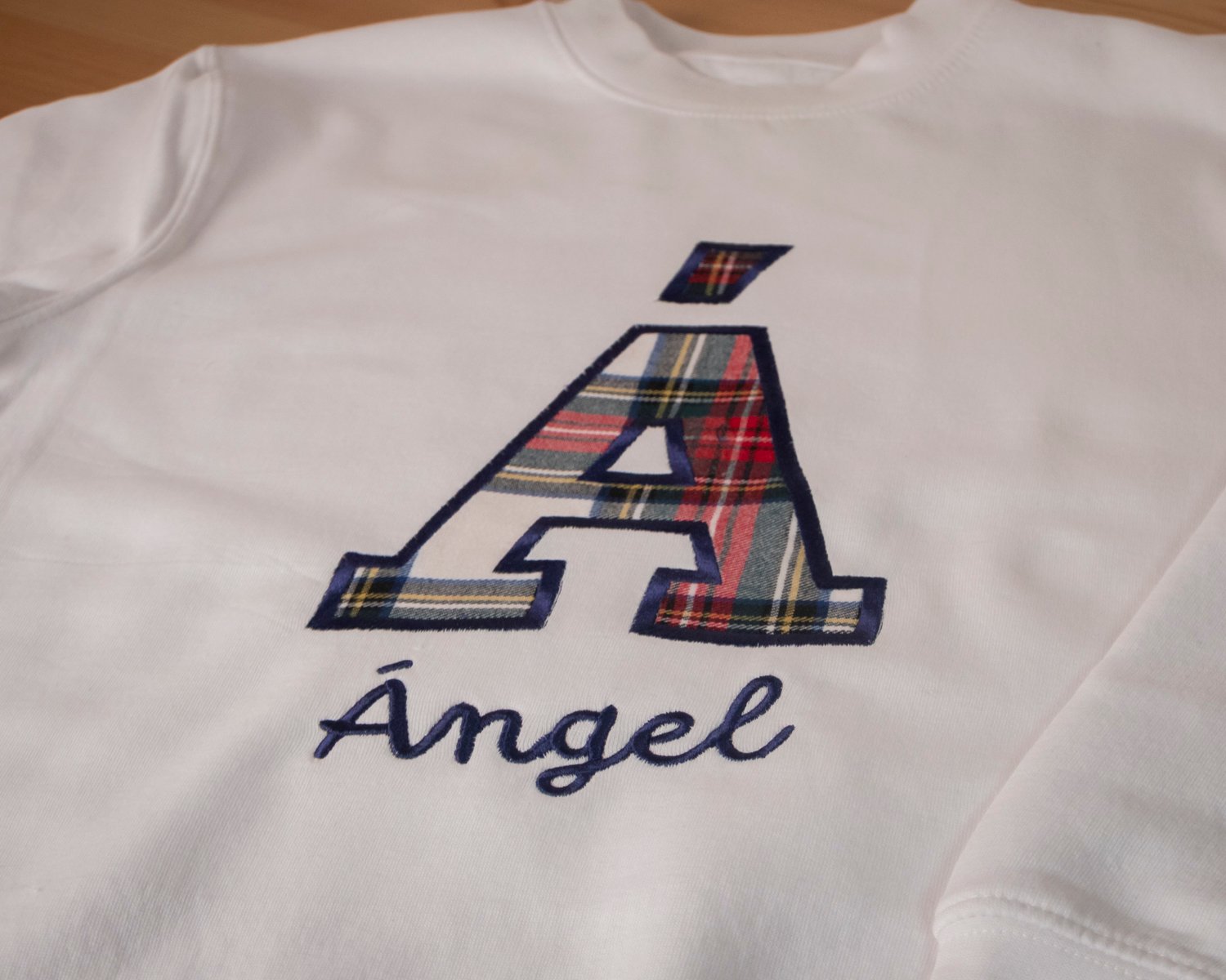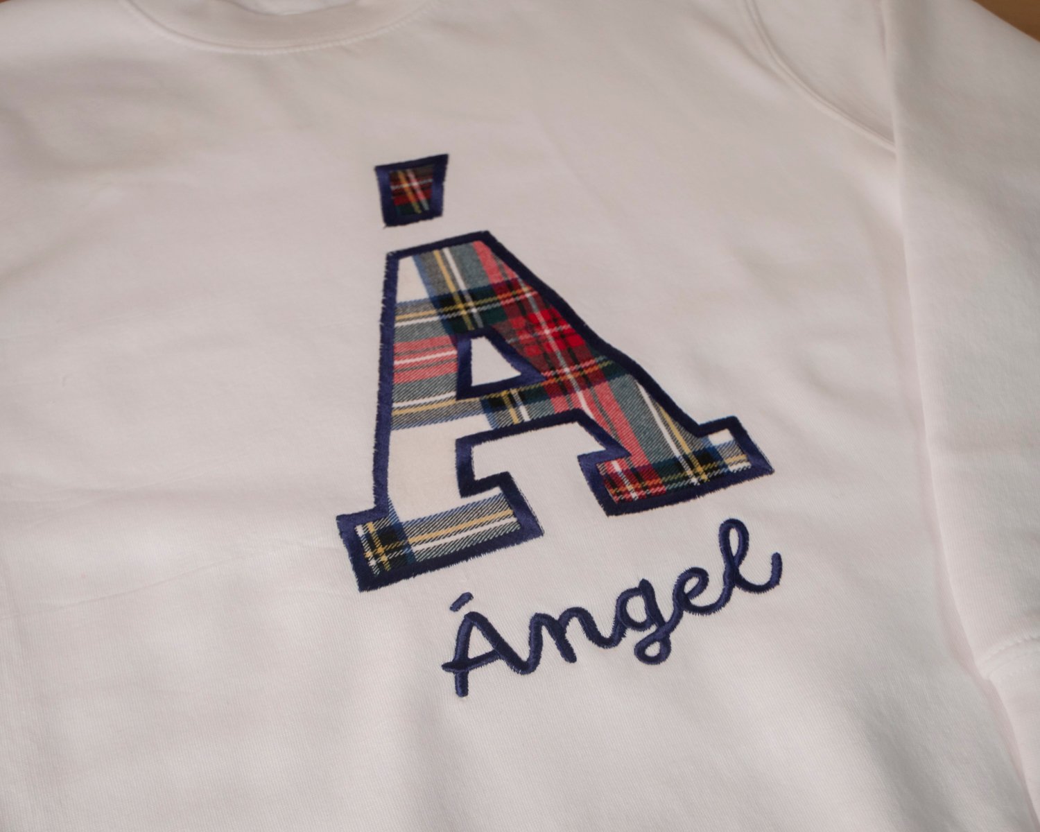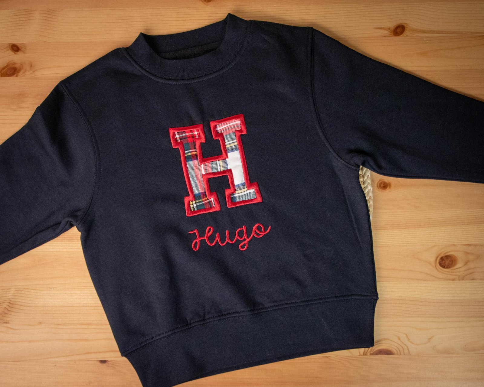 Sudadera personalizada con inicial en tela escocesa y nombre bordado.