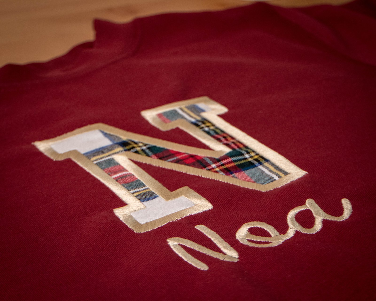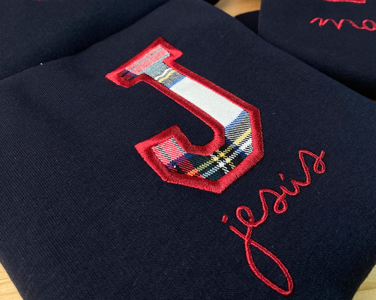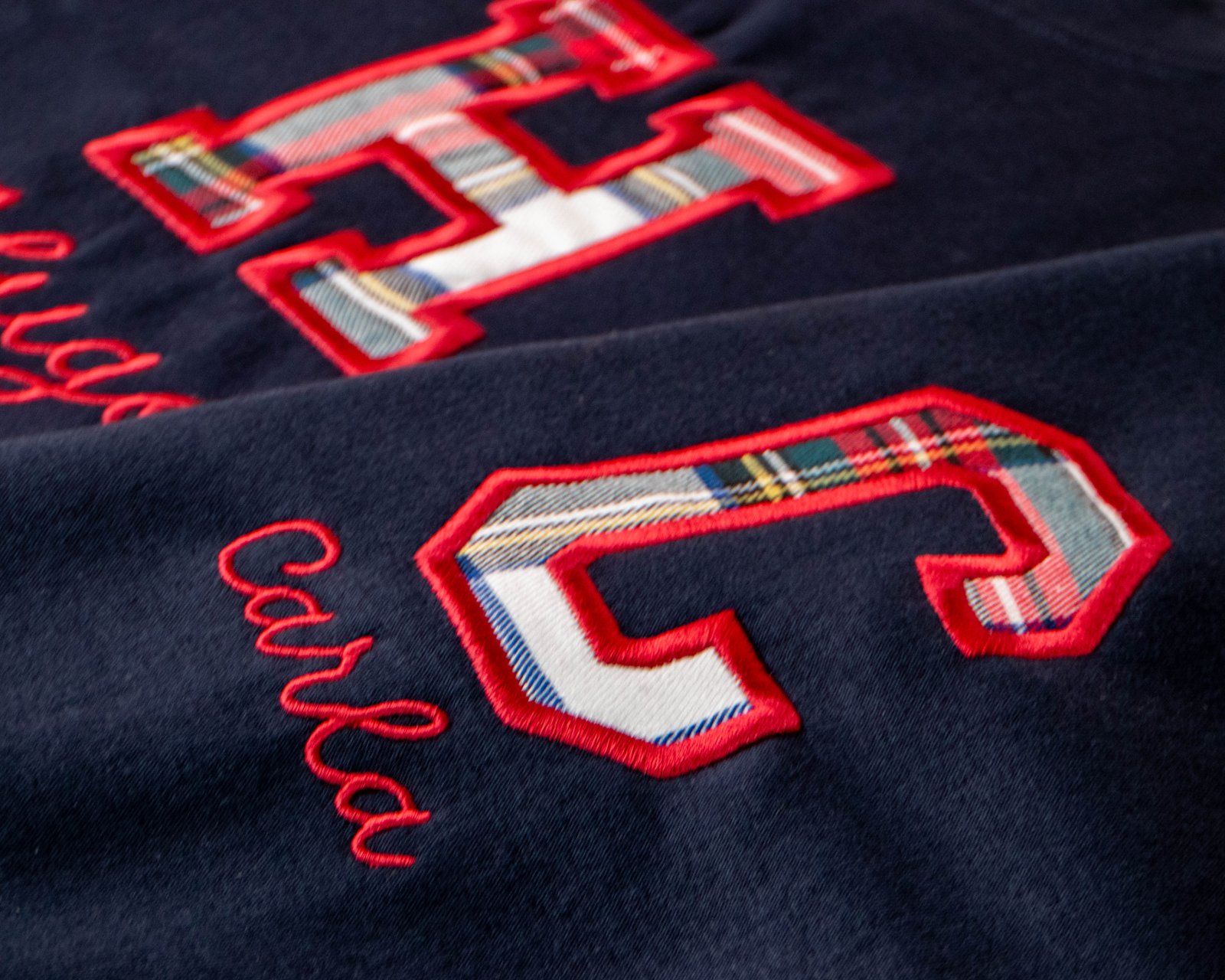 Sudadera personalizada con inicial en tela escocesa y nombre bordado.