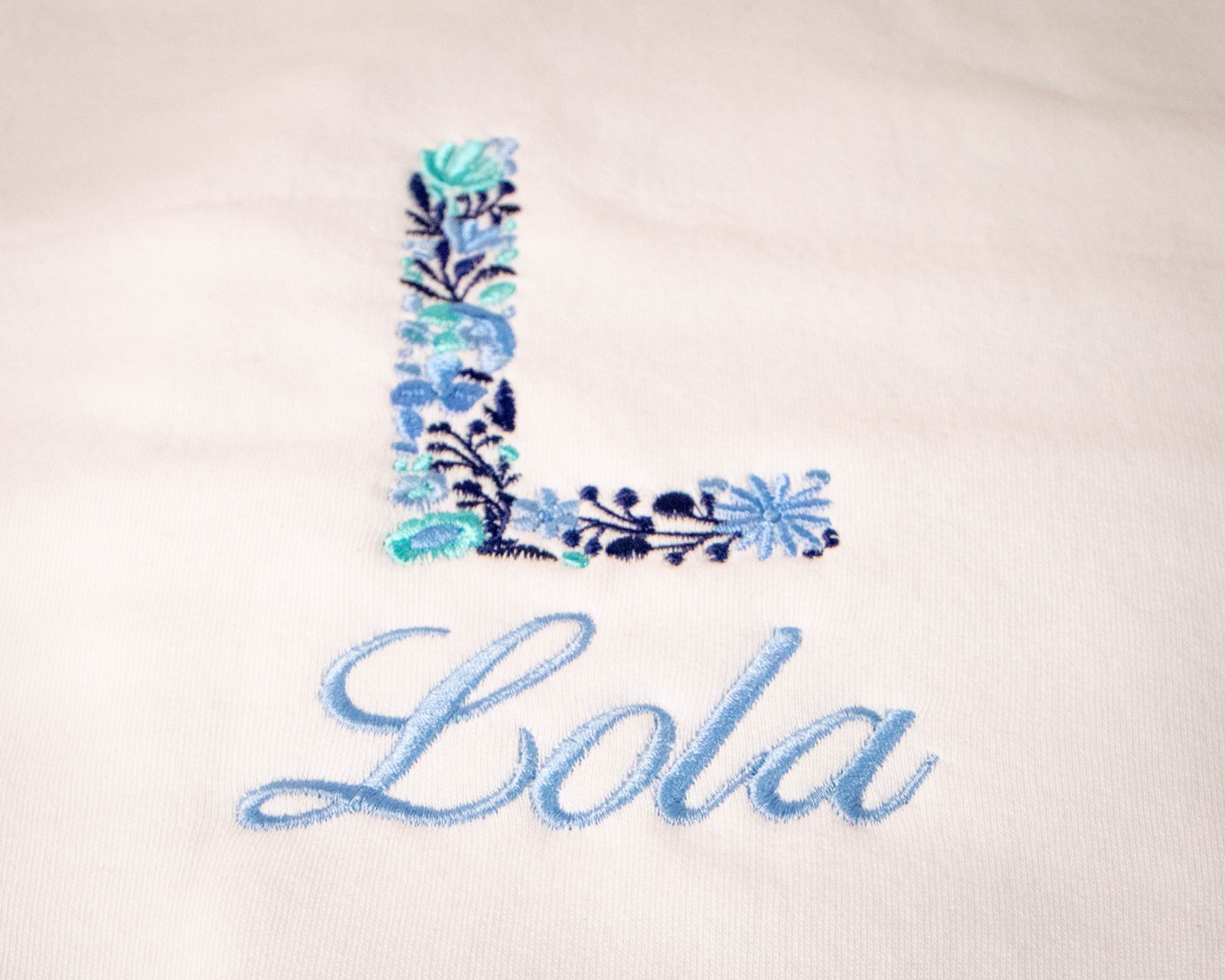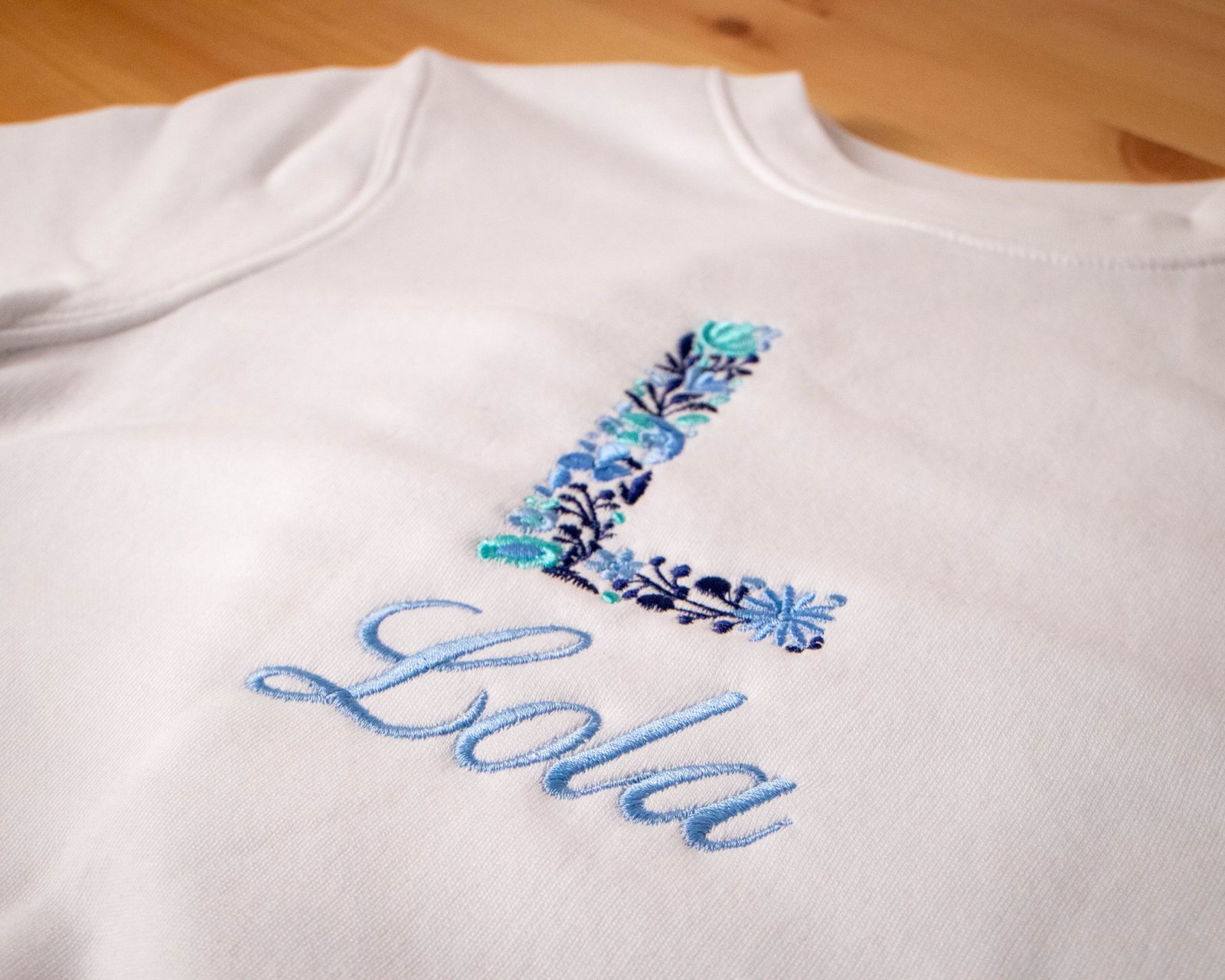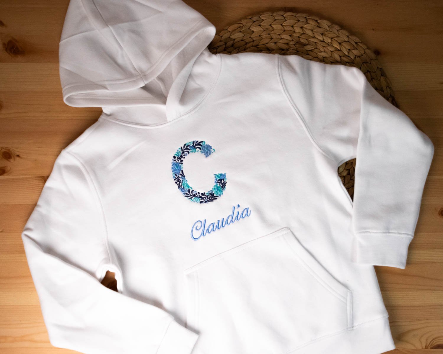 Sudadera personalizada con inicial de flores y nombre bordado.