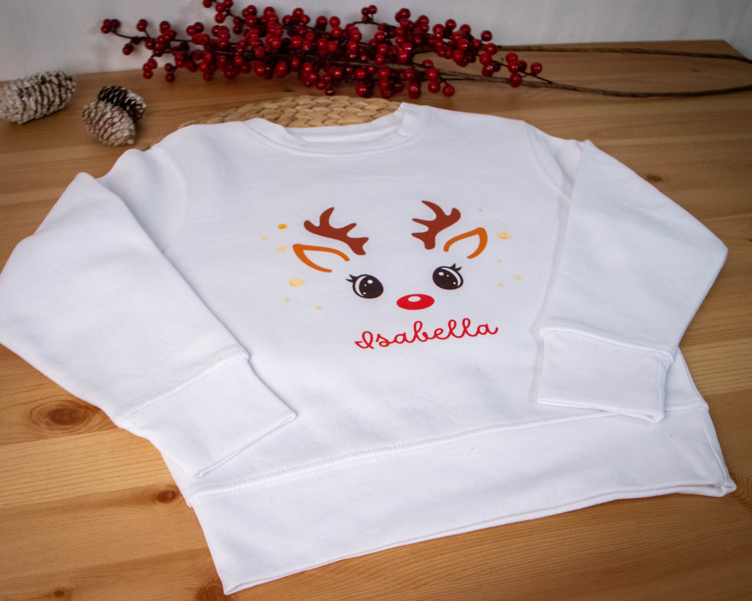 Personaliza la Navidad de tu peque con nuestra sudadera de reno Reddy navideño. Diseño único con detalles festivos navideños y su nombre. Suave, cómoda y perfecta para el invierno.