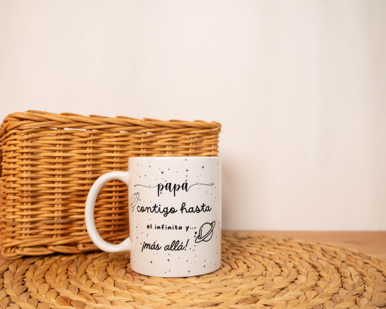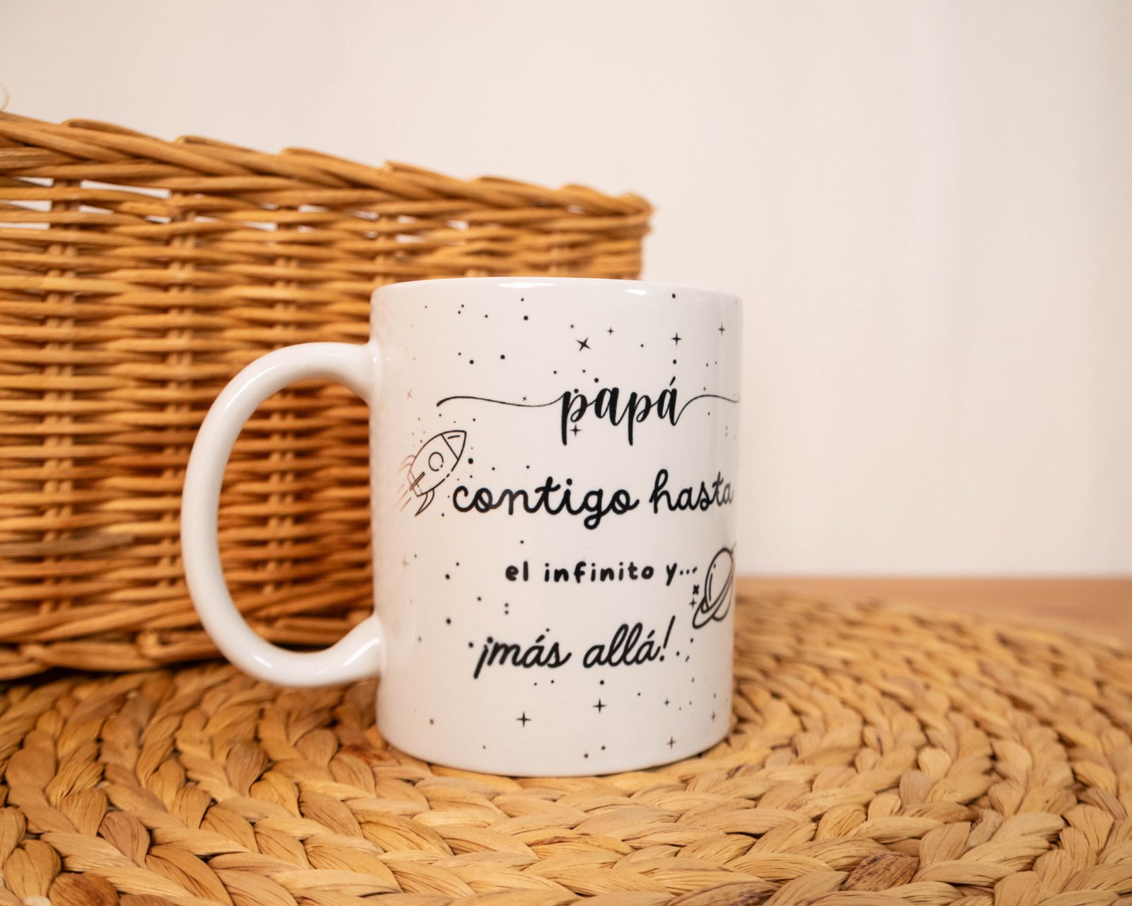Por un lado, la taza luce la emblemática frase: "Papá, contigo hasta el infinito y más allá", una declaración de amor que evoca la fuerza de la relación entre padre e hijo, inspirada en la idea de que juntos pueden conquistar cualquier universo. Al girarla, se descubre la adorable ilustración de los astronautas, lo que la convierte en un regalo único y especial, perfecto para sorprender a papá en cualquier ocasión.