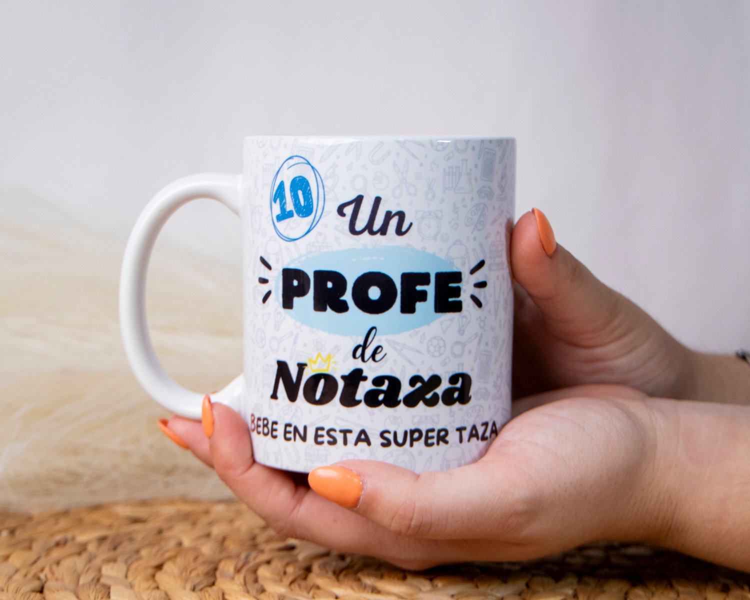 Hay profes que nos acompañan, nos hacen crecer y aprender cada día, que han formado parte de nuestra vida, que son profes de notaza, a los que les queremos agradecer todo lo que han hecho por nuestros peques y lo mucho que se han esforzado. Qué mejor manera, que sorprenderles con este super regalo, una taza nunca pasa de moda y siempre que la utilice recordará a sus alumnos. Este regalo es personalizable con el nombre de la profe o del profe. Además, si te gusta el diseño pero quieres cambiar la frase, podemos hacerlo (+3,00€). Seguro que la seño, maestra o profe se merece un regalo como este y estará súper contenta y orgullosa de tener un recuerdo para siempre de sus peques. Sorprende con nuestra Taza Profe de Notaza